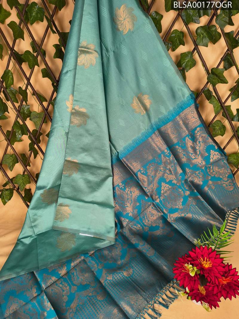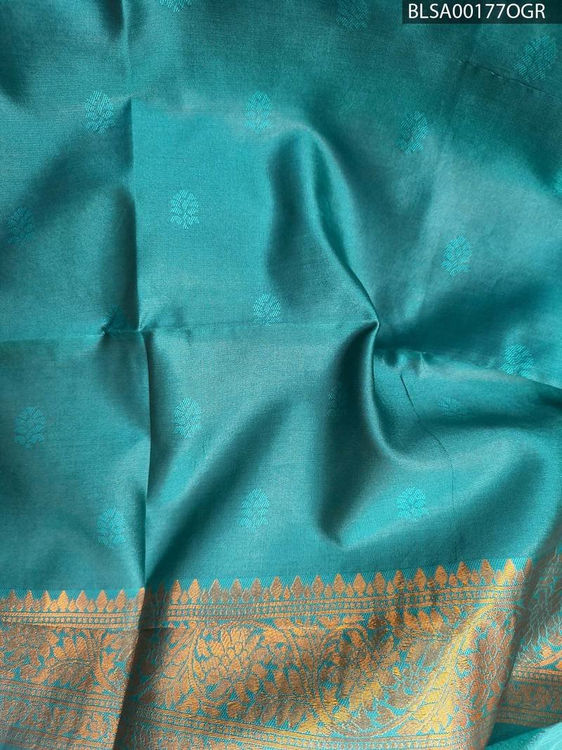 This stunning saree features a soothing aqua blue body embellished with delicate gold floral motifs that bring elegance to any outfit. The rich pallu is adorned with elaborate patterns and a contrasting design that captures attention. The accompanying blouse complements the saree beautifully, making it perfect for festive occasions.