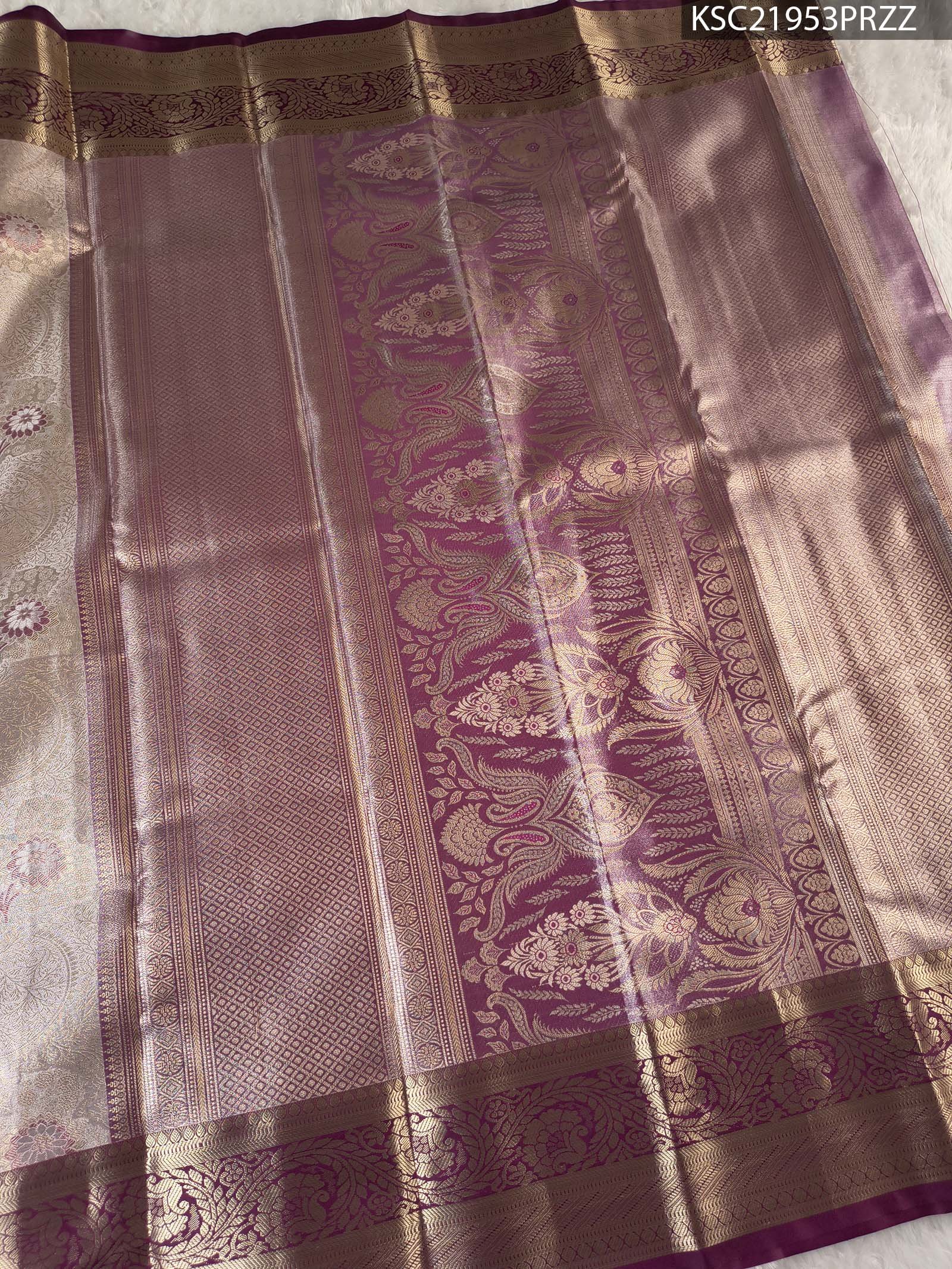 This beige tissue saree is a masterpiece with its delicate floral motifs elegantly woven across the body, exuding a subtle sheen and luxurious feel. The rich pallu, adorned with intricate zari work, adds a regal touch that captures the essence of traditional opulence. Completing the ensemble is a matching blouse featuring a zari border, enhancing the overall grandeur of this stunning piece.