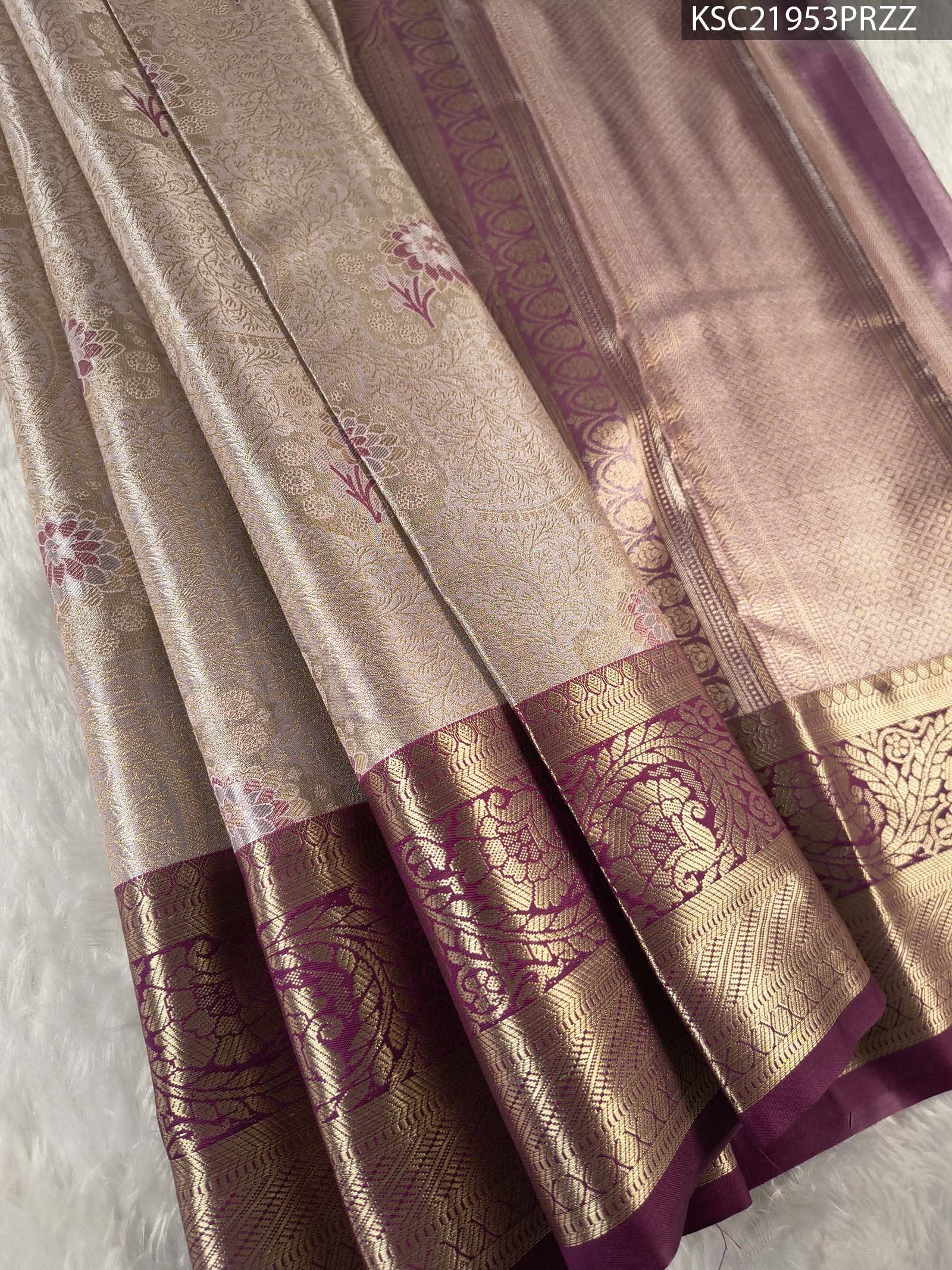 Exquisite Beige Tissue Saree with Delicate Floral Patterns and Opulent Zari Pallu. Includes unstitched blouse.