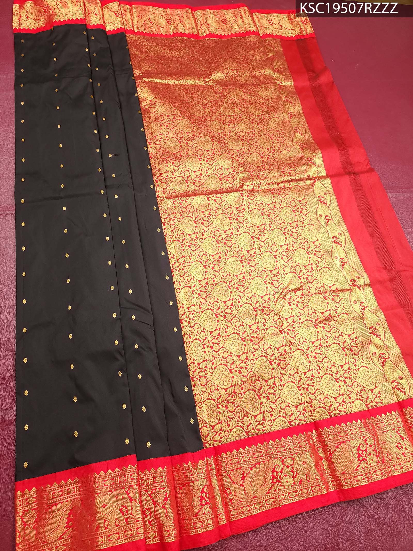 Elegant black saree adorned with golden motifs and a breathtaking rich zari pallu. Includes unstitched blouse.