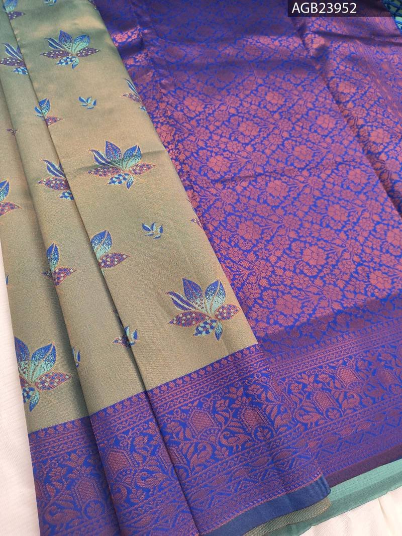 This saree features a beautiful blend of soft blue and green hues, adorned with intricate floral motifs throughout. The rich pallu showcases a striking design, while the blouse complements the saree seamlessly. Experience the elegance of its detailed border that adds a finishing touch to this traditional piece.