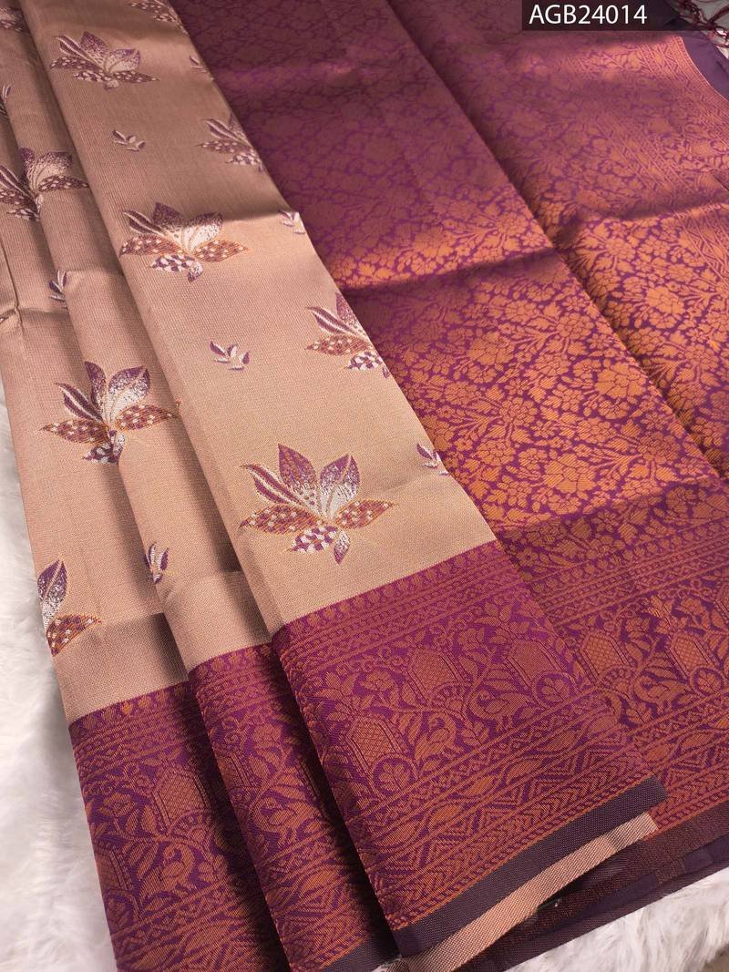 Peach and Dark Purple Fancy Saree with Beautiful Floral Motifs and Intricate Border