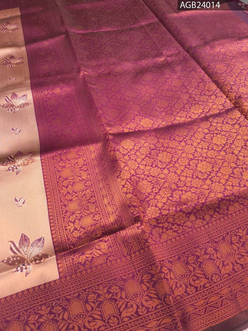 This exquisite saree features a soft peach body adorned with delicate floral motifs, creating an enchanting visual appeal. The dark purple pallu showcases rich weaving and intricate patterns, elevating its elegance. Complementing the saree, the blouse matches the pallu color and design, creating a cohesive look.