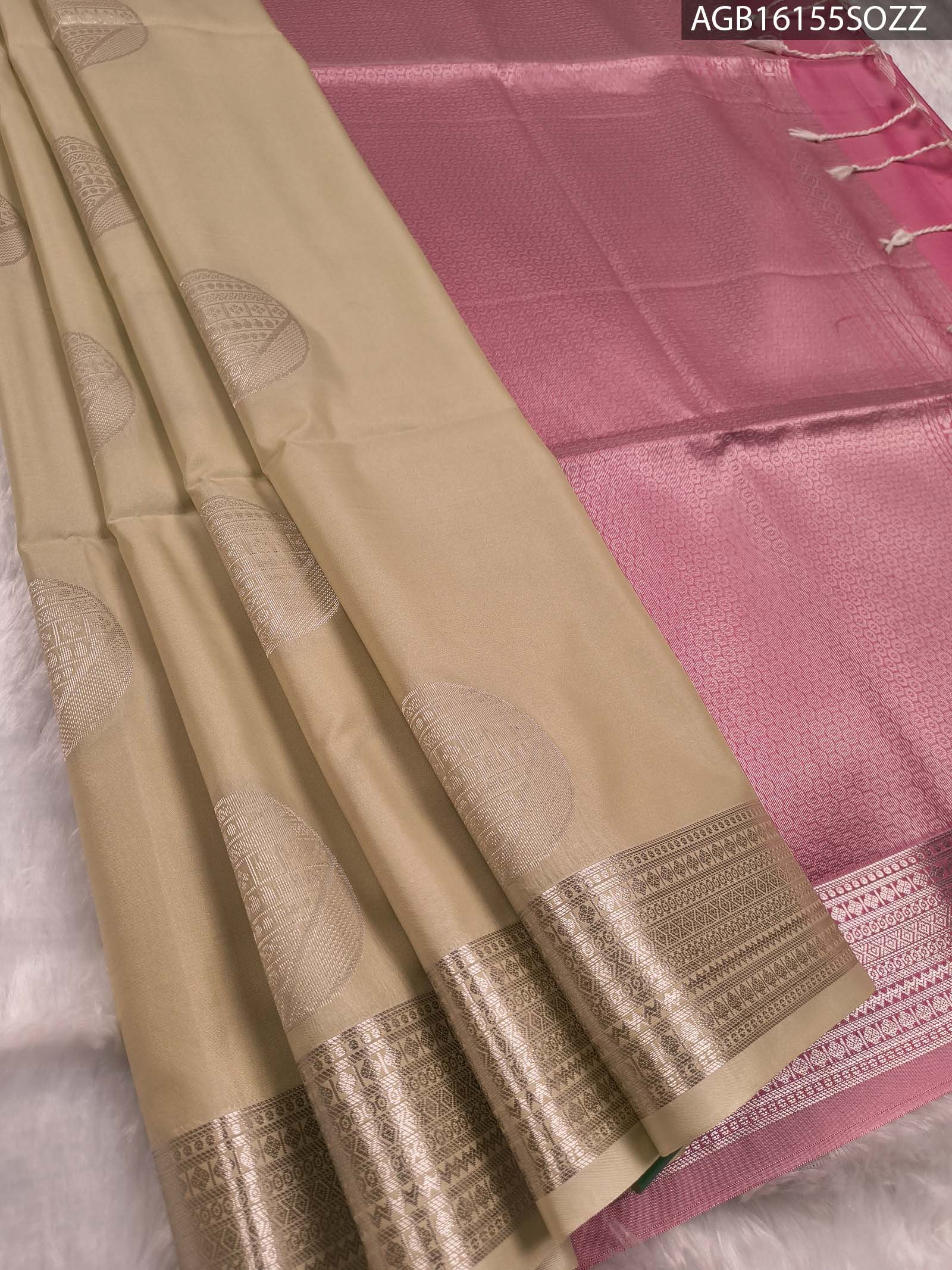 This beautiful soft silk saree features a soothing beige body adorned with intricate round motifs, offering a gentle and elegant tone. The pallu boasts a vibrant pink hue with exquisite weaving, adding richness to the ensemble. The saree is enhanced by a striking zari border that highlights its luxurious feel. A matching pink blouse with a zari border completes the look.