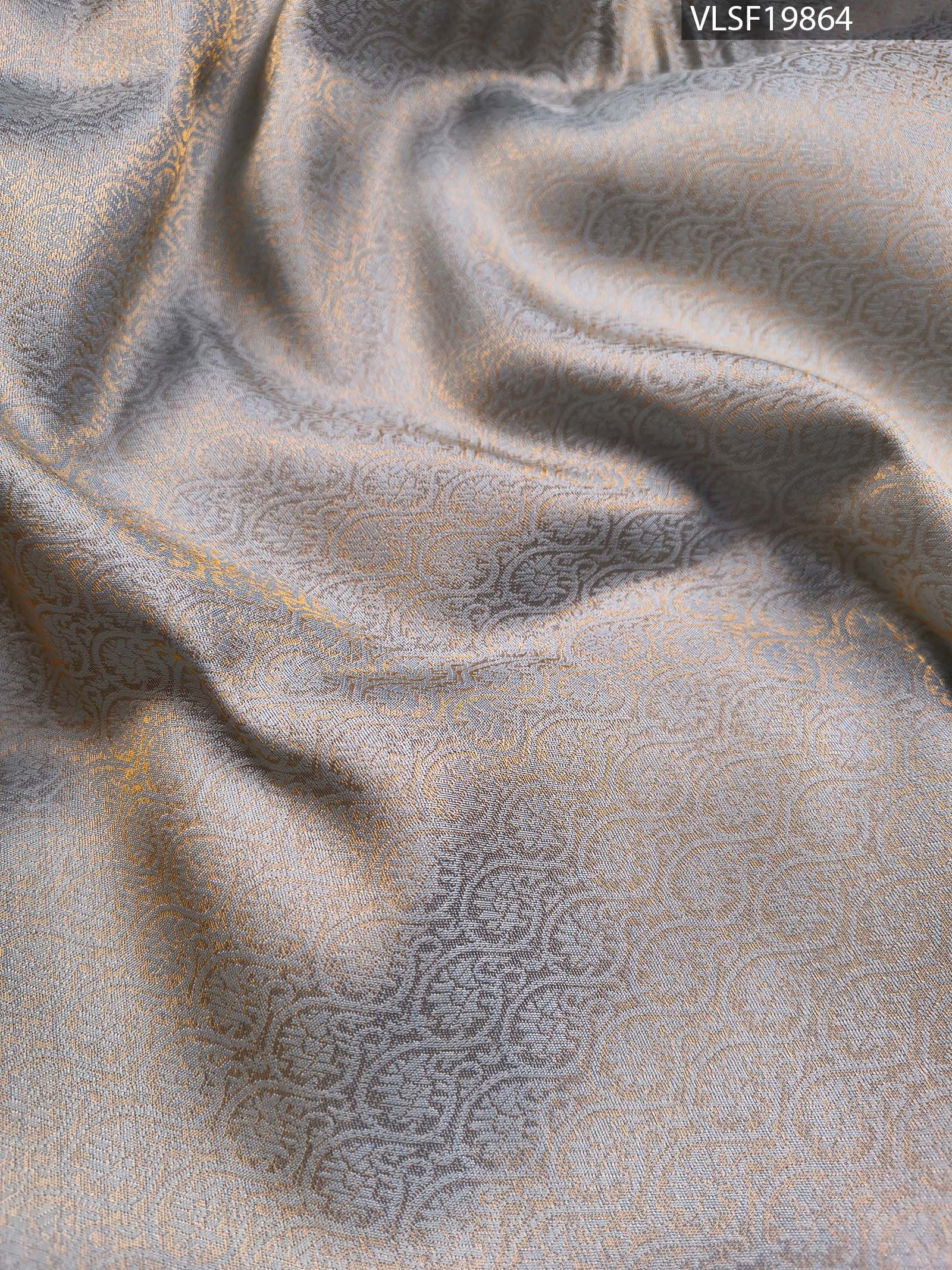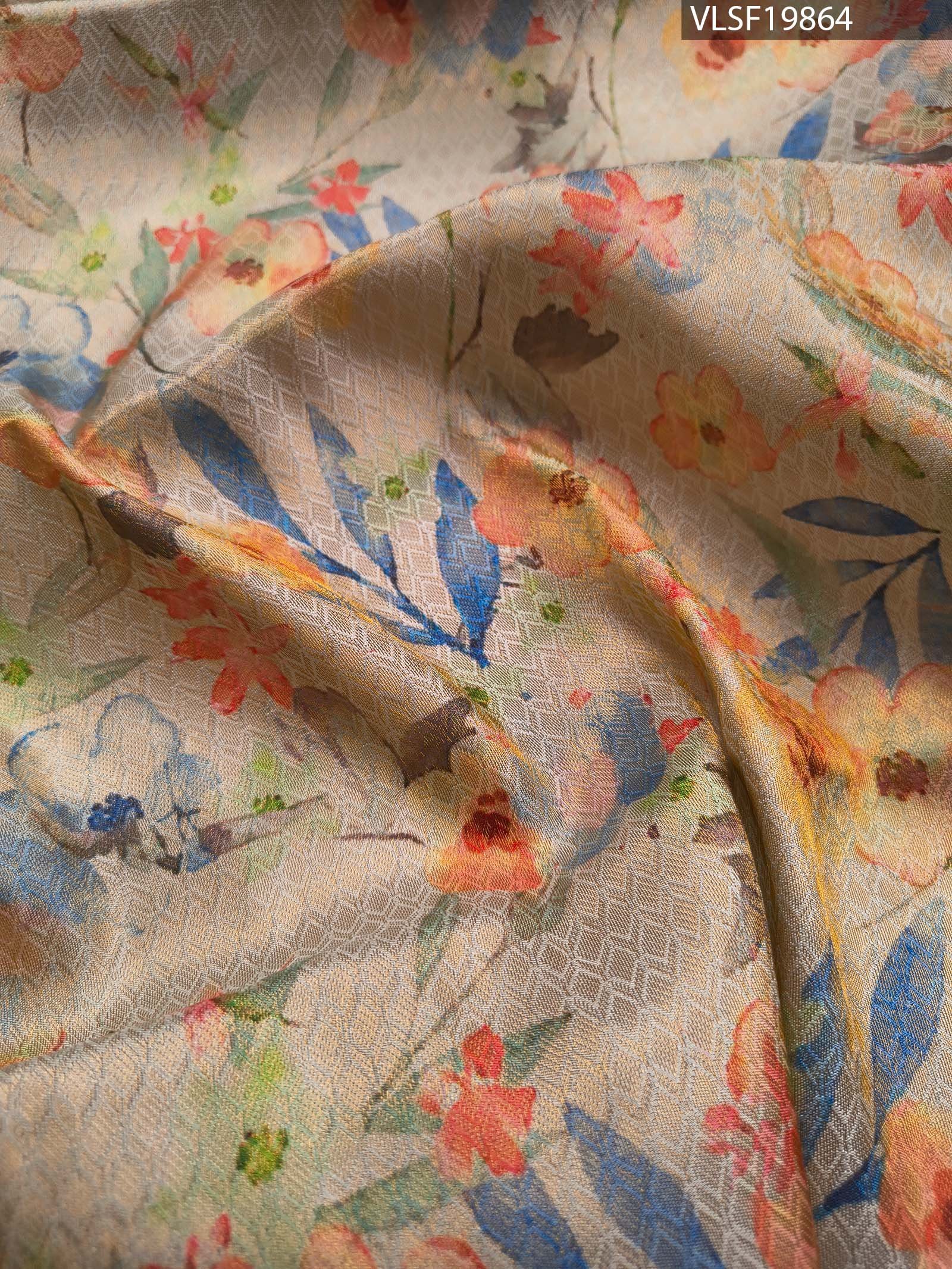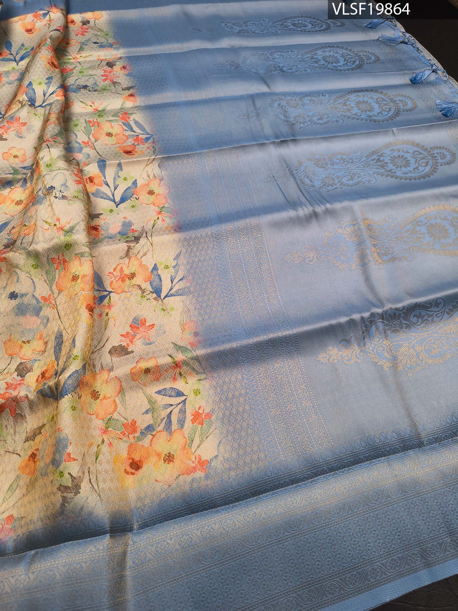 Elegant Beige and Sky Blue Fancy Silk Saree with Captivating Floral Designs and Intricate Border. Includes unstitched blouse.