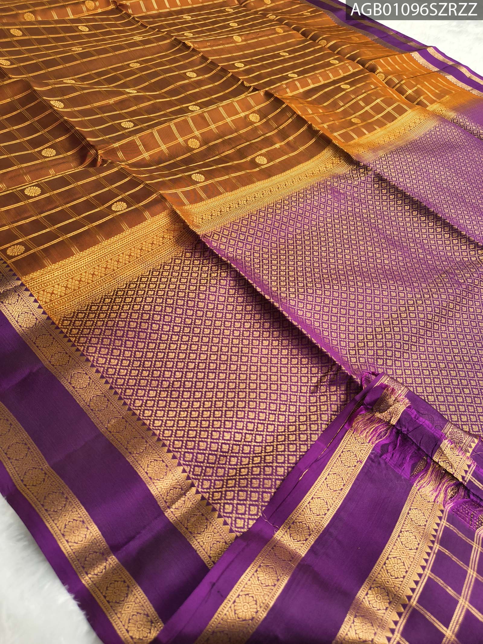 A luxurious blend of copper brown and purple with intricate zari work.