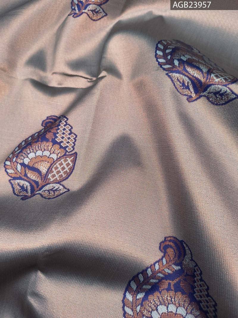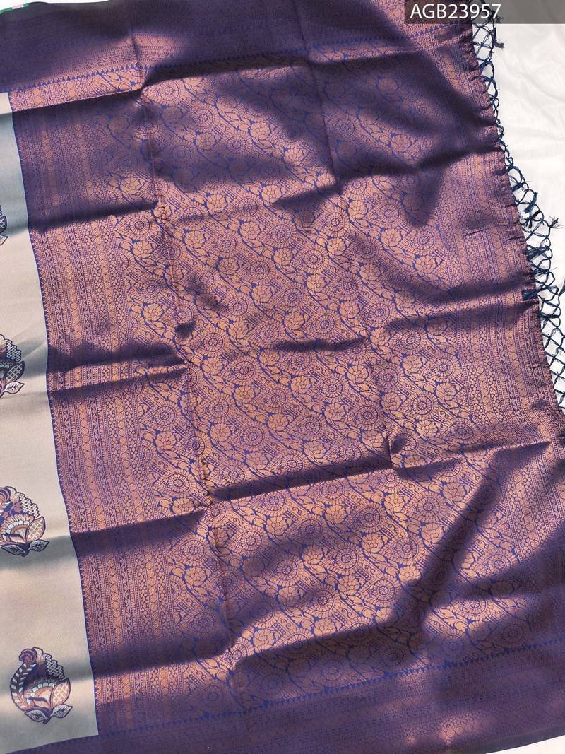 This beautiful saree features a soft grey body adorned with intricate motifs and a rich purple pallu that adds to its charm. The elegant patterns weave a story of artistry, while the designer blouse complements the saree perfectly. Perfect for festive occasions, it radiates sophistication and style.