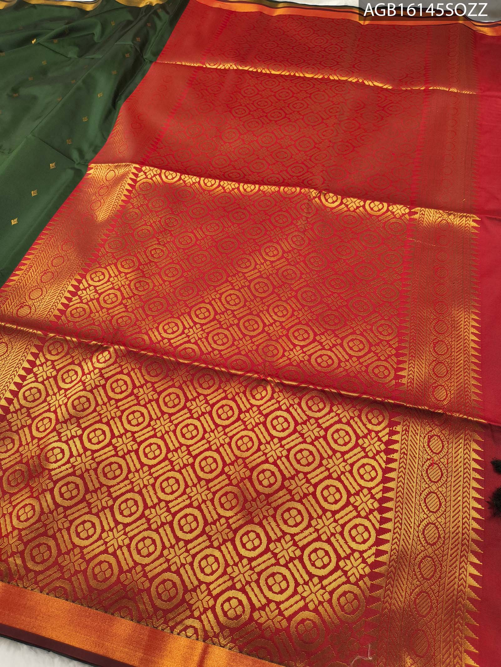 This exquisite saree is crafted from soft silk in a deep green hue, adorned with delicate crown motifs that exude elegance and tradition. The fabric feels smooth and lustrous against the skin. The pallu is a beautifully woven rich red with intricate circular designs, adding a touch of grandeur. The border is adorned with a detailed gold pattern that complements the saree perfectly. The blouse comes in a contrasting design, enhancing the overall appeal.