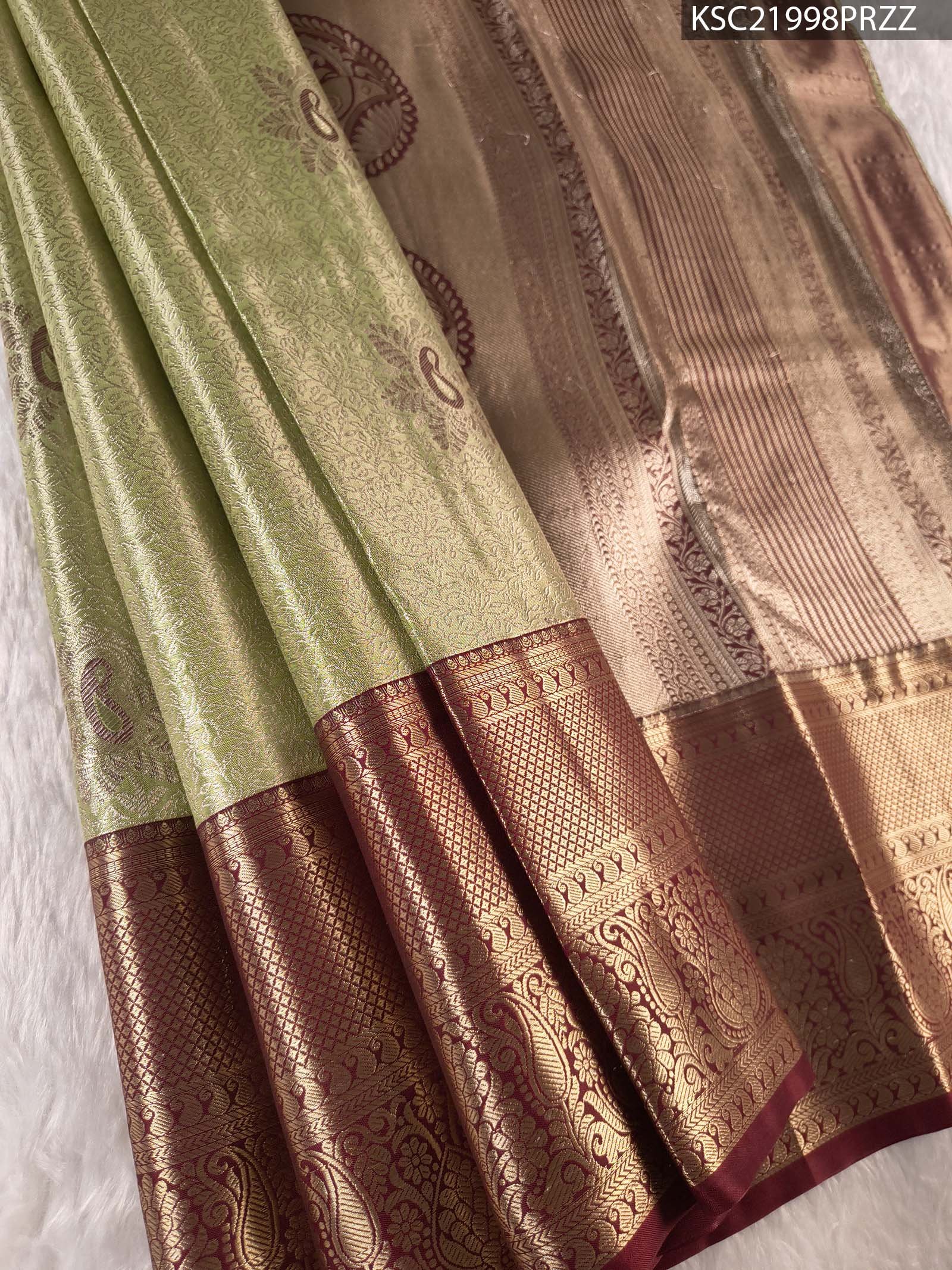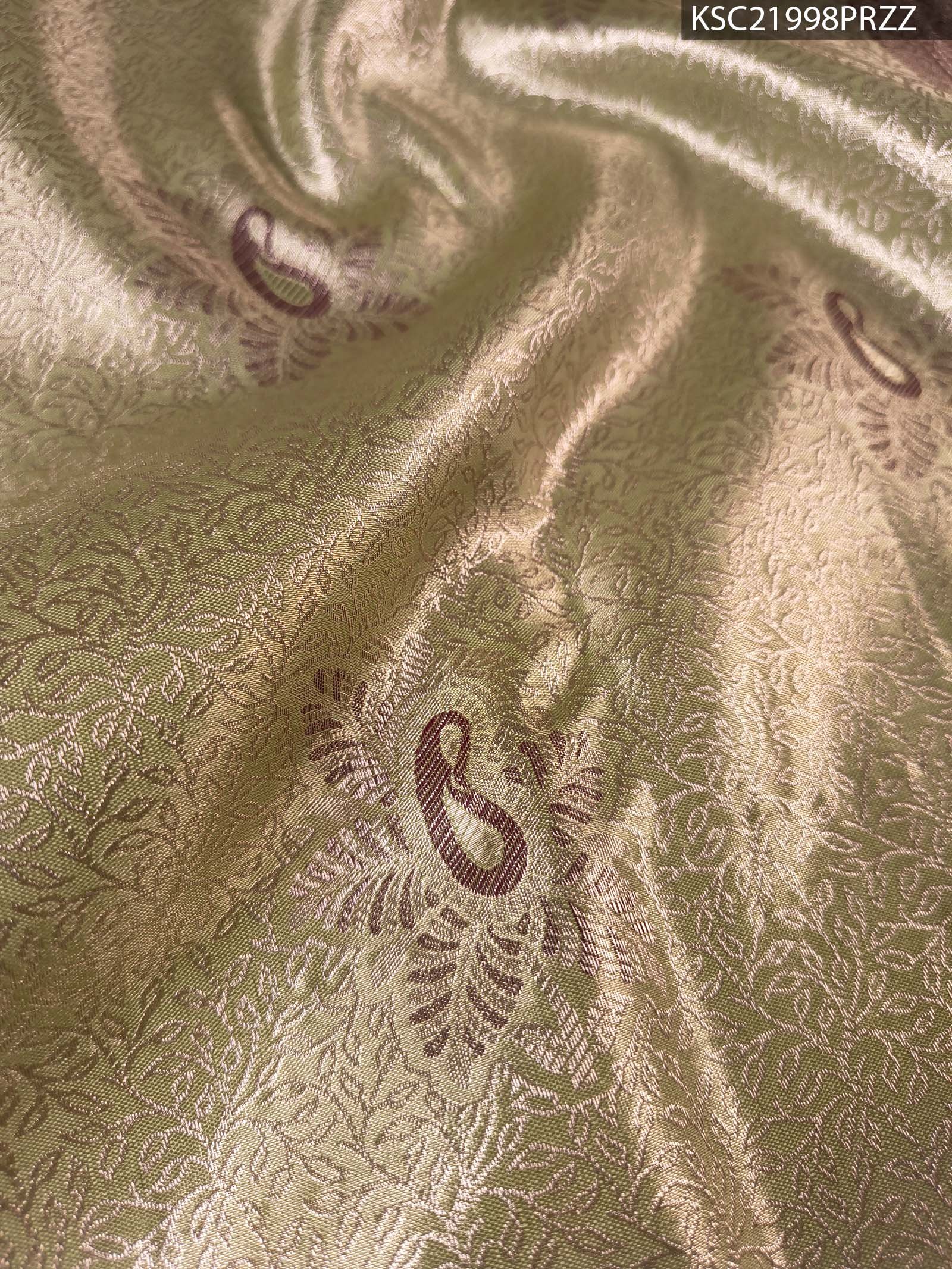 Graceful Green Tissue Saree with Intricate Paisley Motifs and Opulent Zari Border. Includes unstitched blouse.
