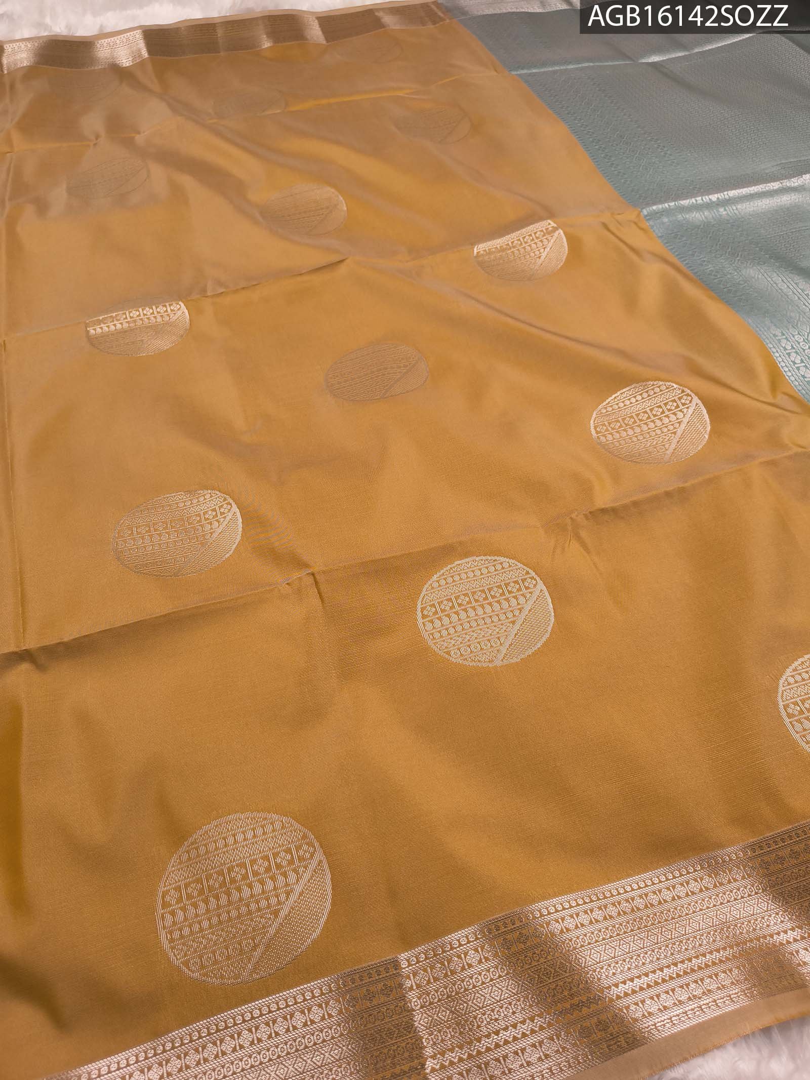 A soft silk saree with a luxurious mustard tone and intricate silver motifs.