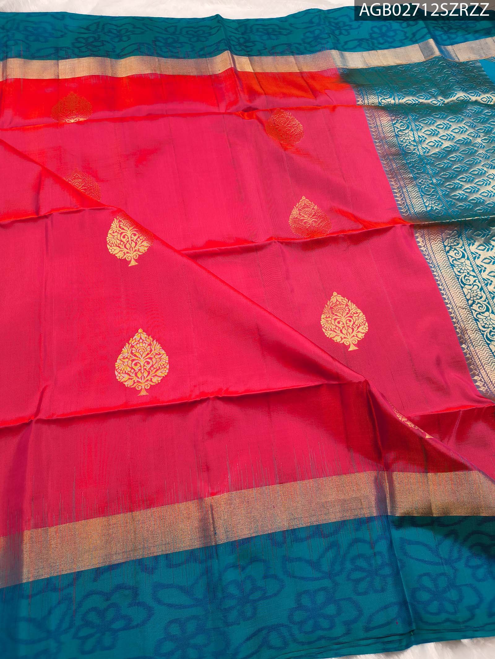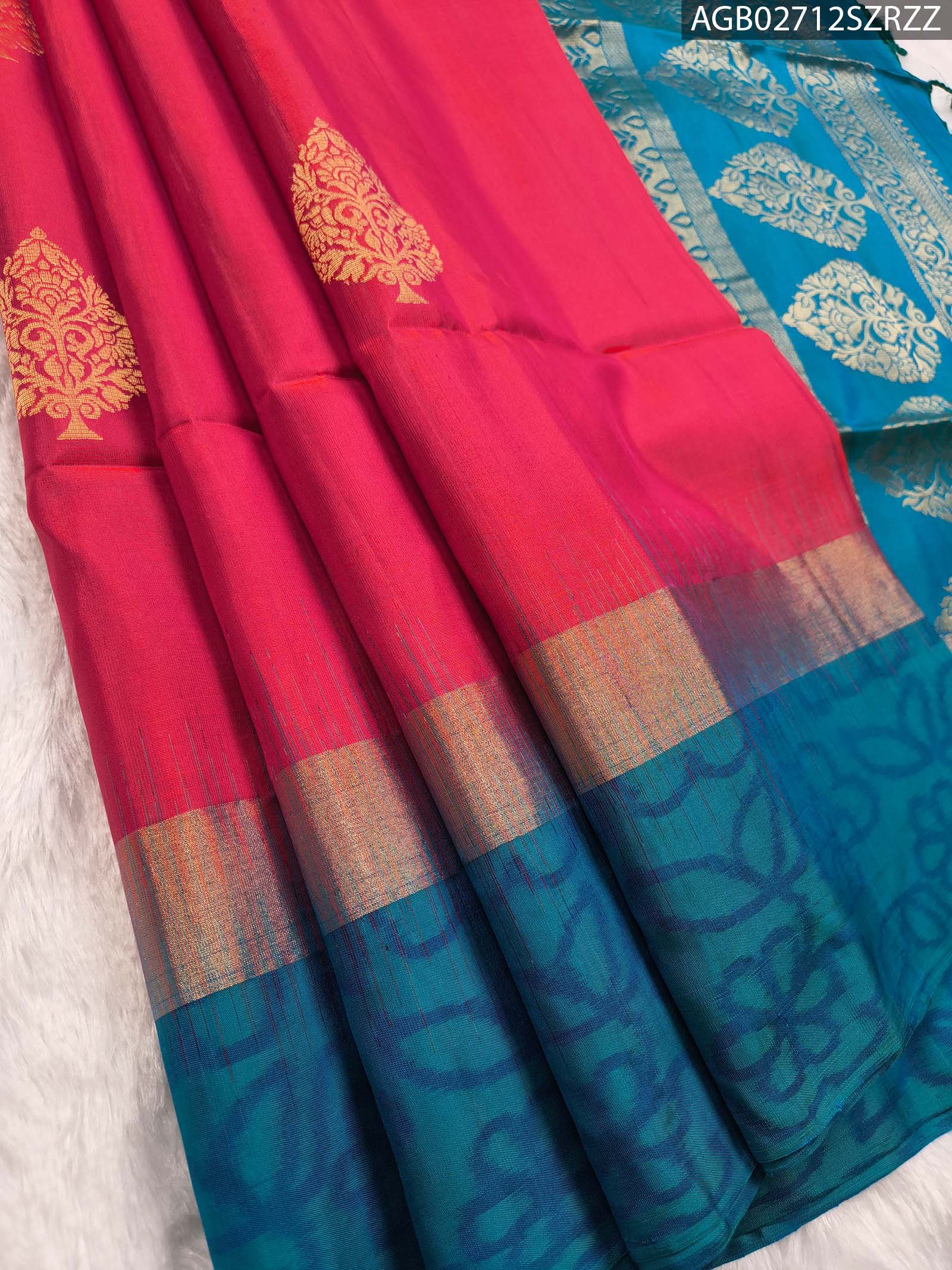 A luxurious blend of vibrant pink silk with intricate motifs and a striking blue pallu.