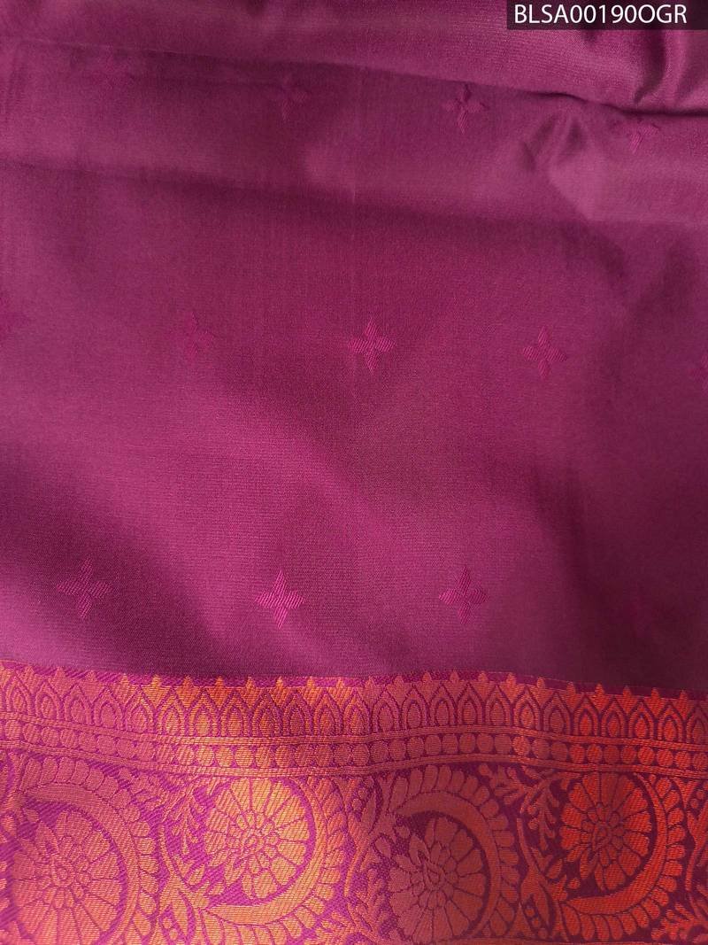 This saree features a beautiful blend of purple and pink shades, adorned with intricate floral motifs that add a touch of elegance. The rich border is accentuated with golden patterns, enhancing the overall charm. The accompanying blouse is perfectly matched to create a harmonious look.