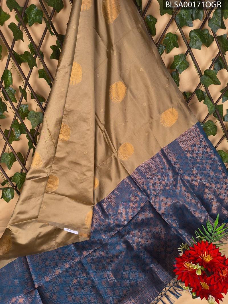This beautiful saree features a soft tan body adorned with delicate golden motifs that add a touch of grace. The rich blue pallu contrasts beautifully, showcasing an intricate design that captivates the eye. The saree comes with a matching blouse that echoes the elegance of the border.