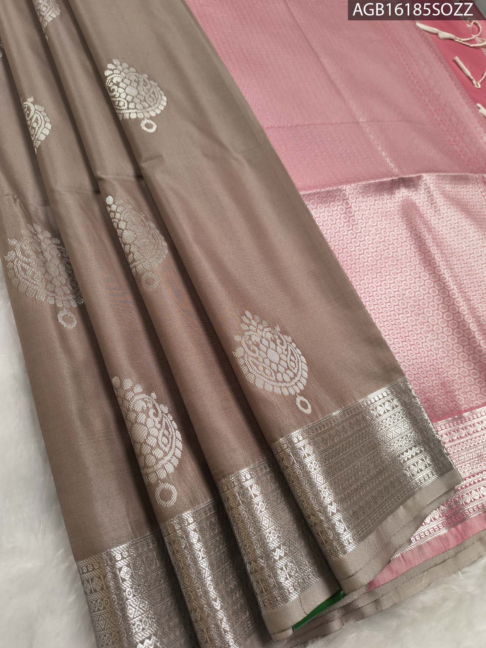 This soft silk saree features a rich taupe body adorned with elegant silver paisley motifs, offering a lustrous and sophisticated look. The pallu is beautifully woven in a soft pink tone with intricate detailing, adding a touch of grandeur. The saree is complemented by a contrasting silver zari border, enhancing its traditional charm. A matching blouse with a zari border completes the ensemble.