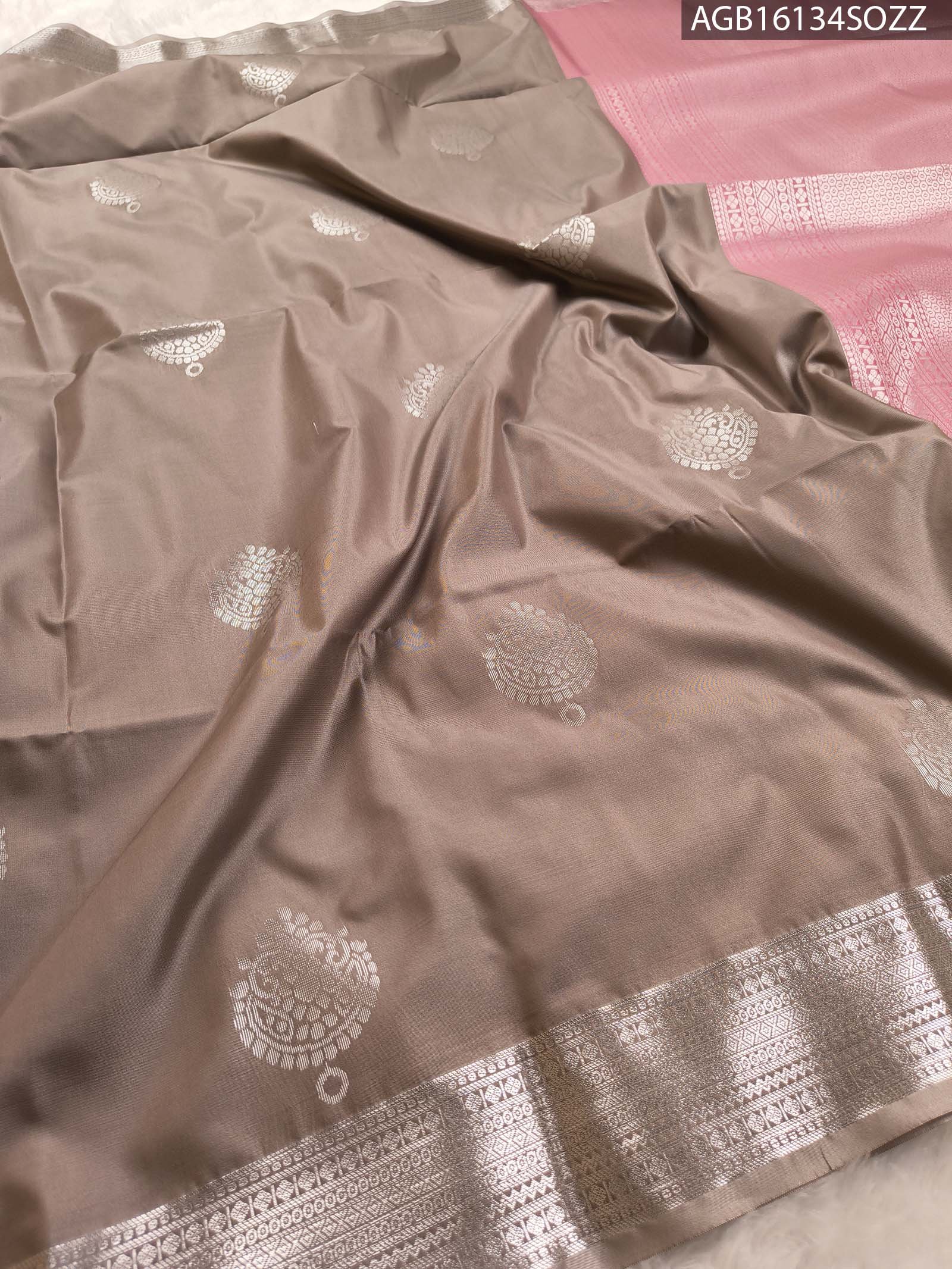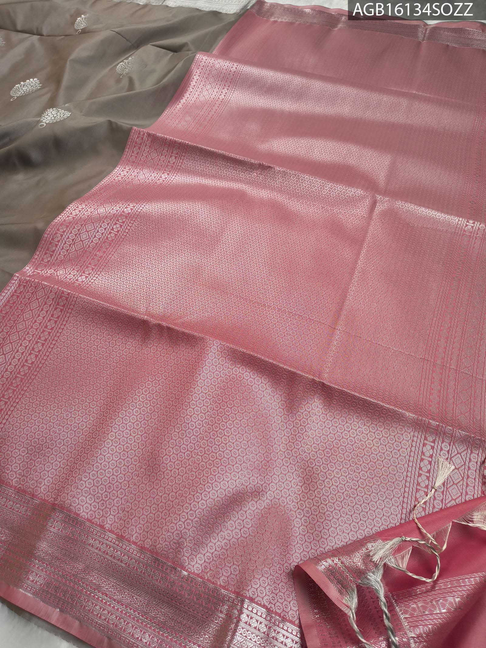 This exquisite taupe soft silk saree boasts delicate silver paisley motifs, offering a graceful and lustrous tone. The contrasting pink pallu features intricate weaving, enhancing its elegance. The rich silver zari border adds a touch of grandeur, while the saree comes with a matching blouse in pink, detailed with a zari border.