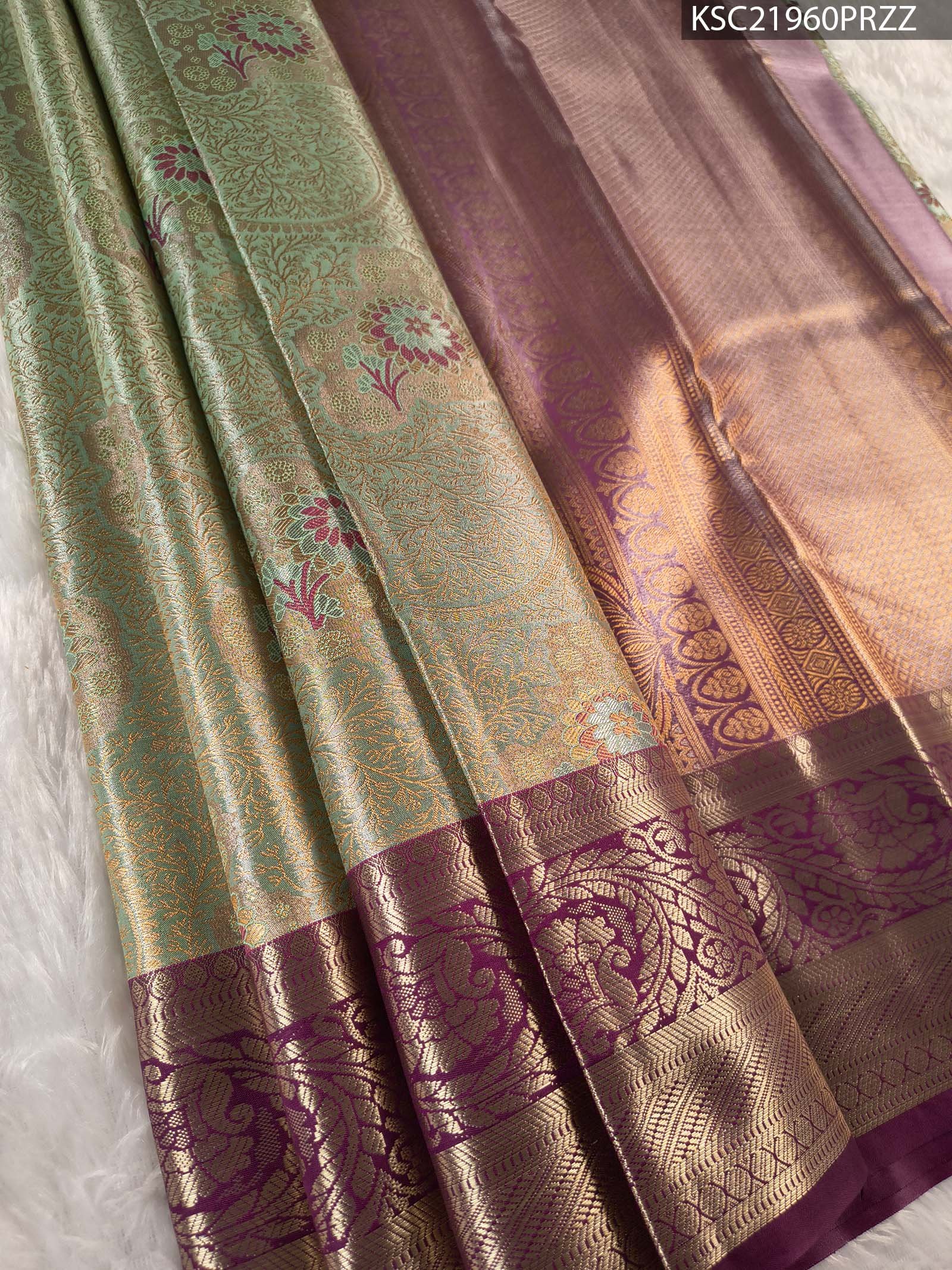 Green and Purple Tissue Saree with Rich Floral Motifs and Intricate Zari Border