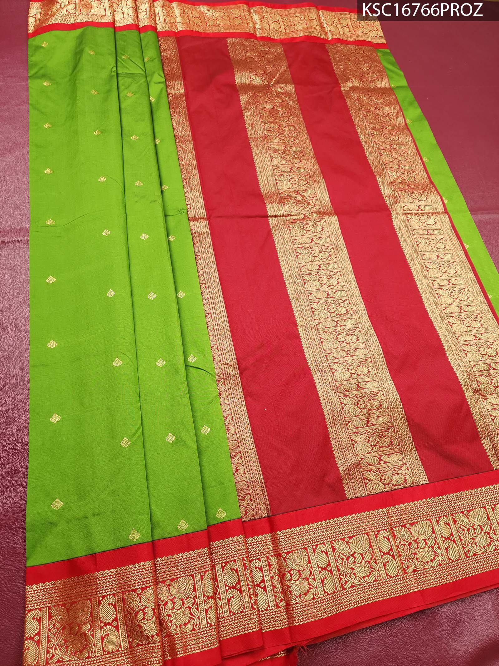 Lush Green Blended Soft Silk Saree with Red Pallu and Rich Zari Border. Includes unstitched blouse.
