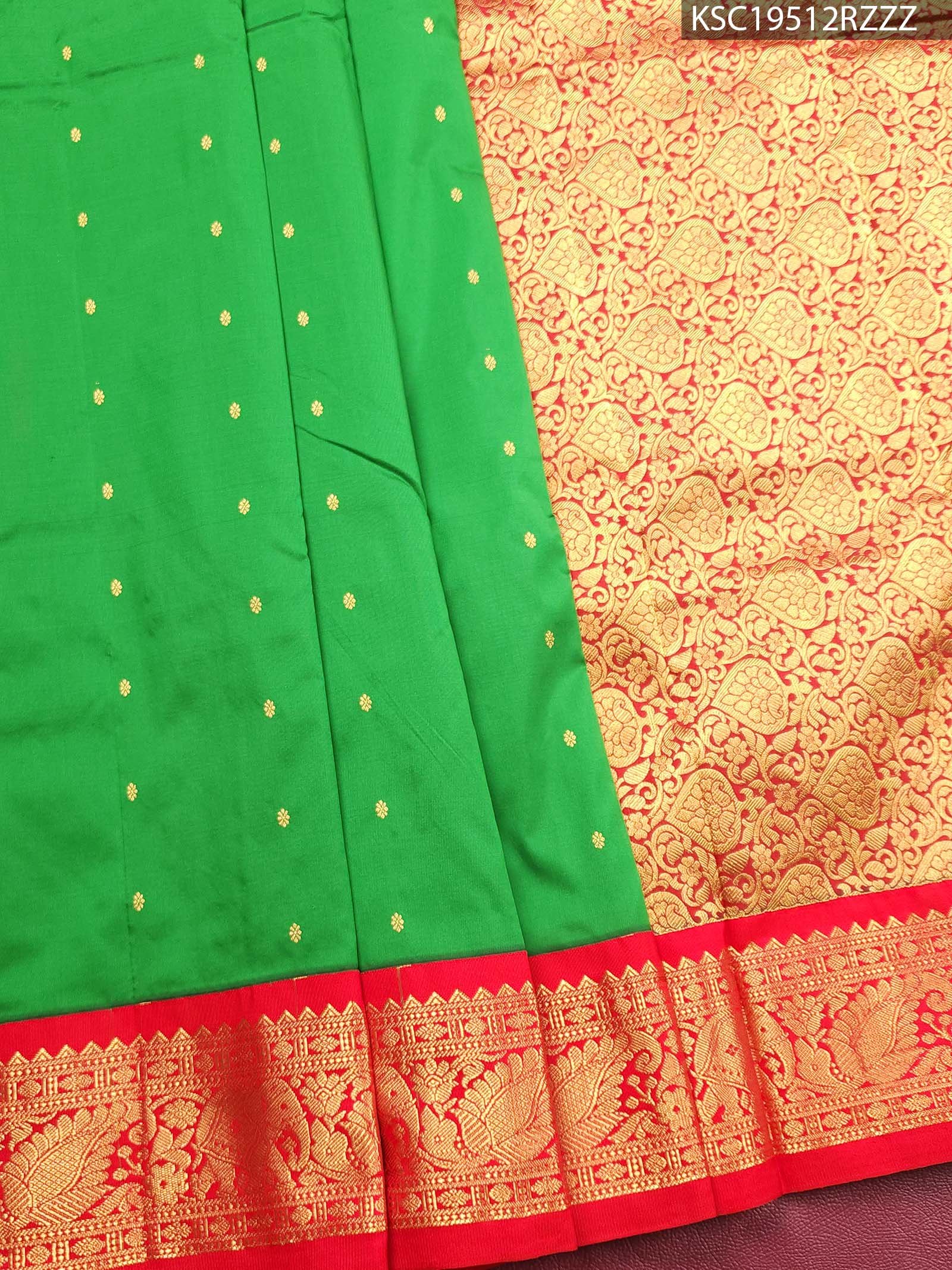 Red and Green Blended Soft Silk Saree with Floral Motifs and Zari Temple Border