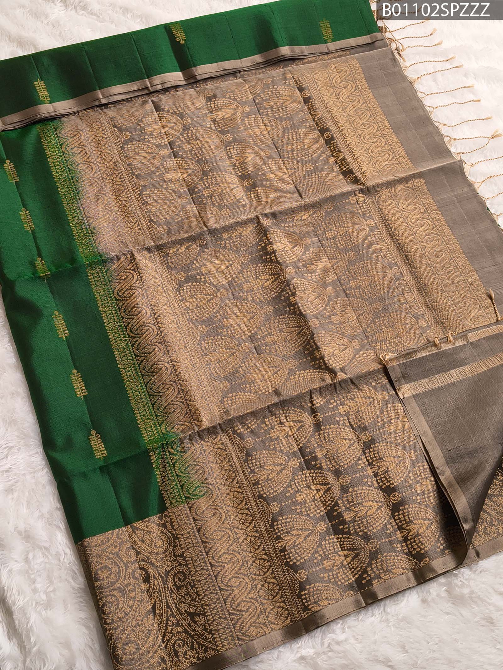 Graceful Kanchipuram pure silk saree in bottle green and Grey Pallu with golden zari motifs. Rich traditional pallu and Silk Mark certified.