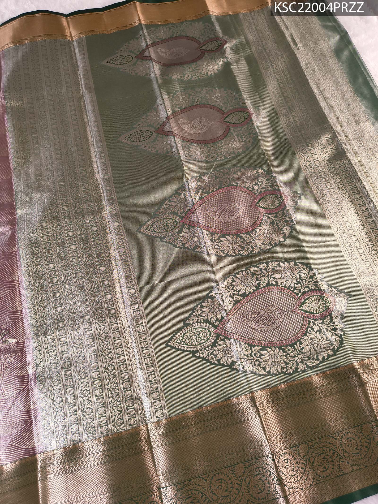 Lavender and Green Tissue Saree with Rich Zari Pallu and Floral Border