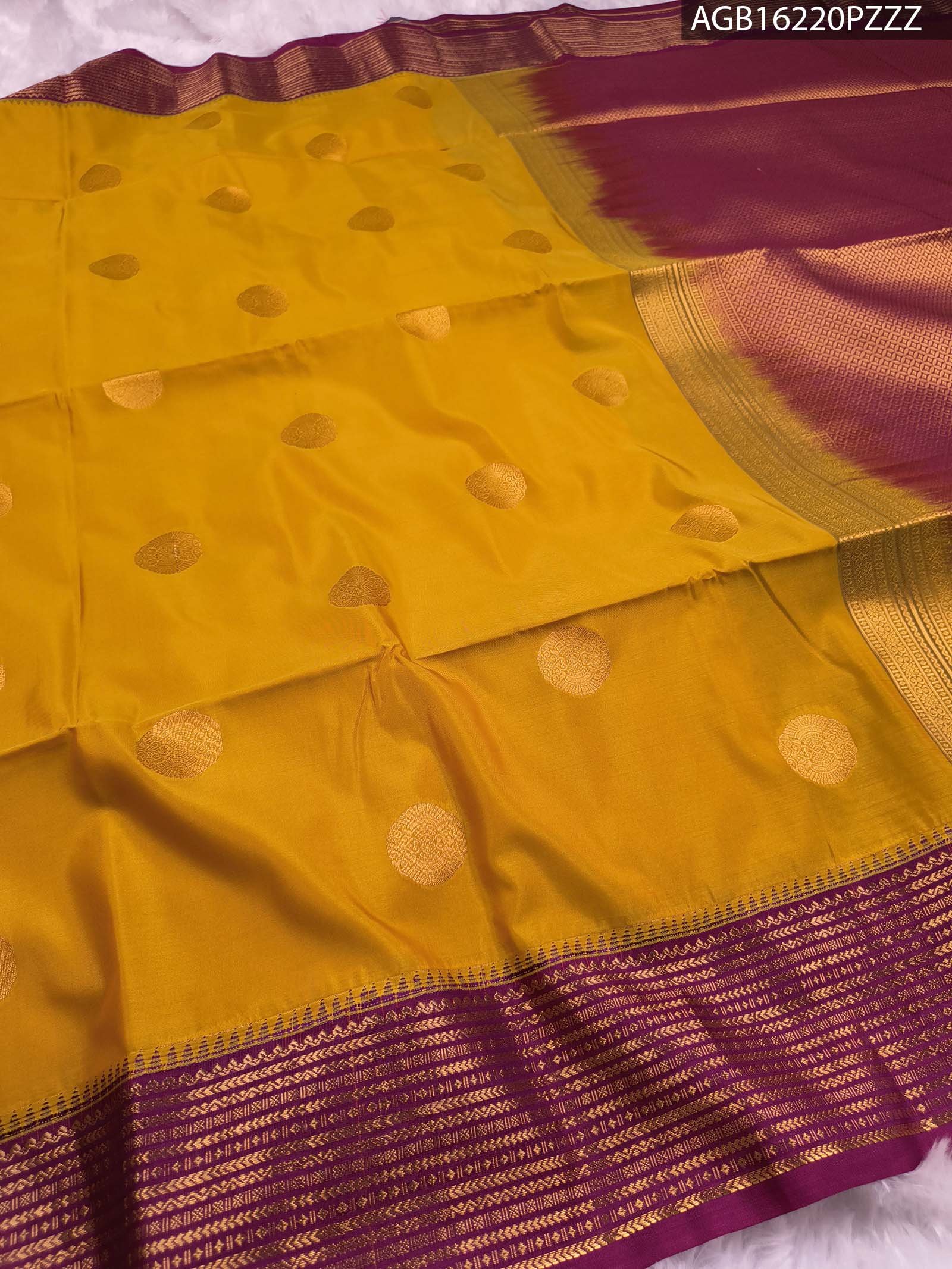 Embrace the allure of tradition with this stunning mustard silk saree adorned with a luxurious purple pallu.
