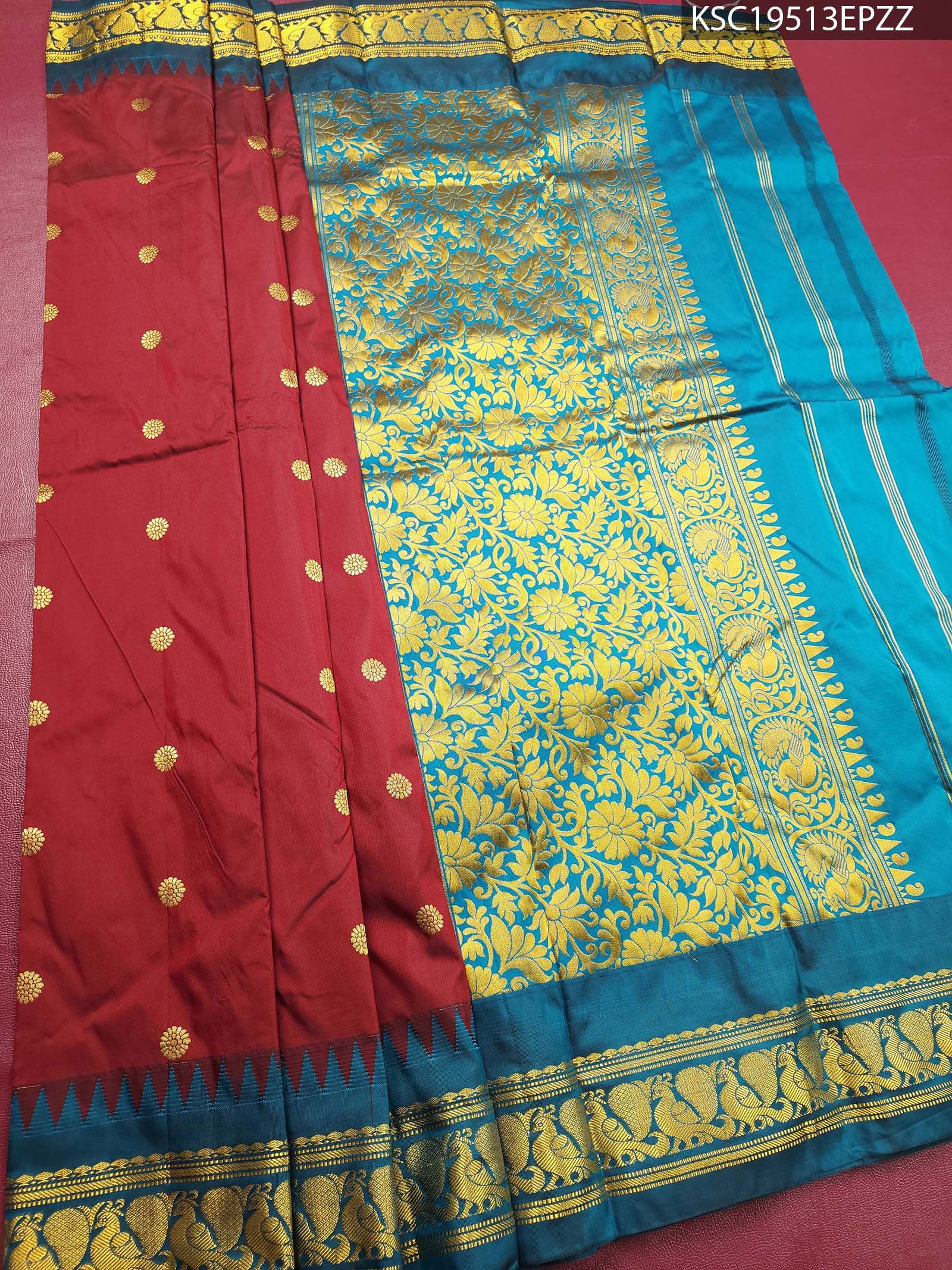 This exquisite maroon blended soft silk saree exudes elegance with its delicate golden floral motifs gracefully adorning the body. The lush blue pallu is a masterpiece in itself, showcasing ornate floral brocade work that adds a touch of grandeur. The saree is complemented by a rich blue border with intricate zari weaving. Paired with a matching blouse, this saree is perfect for making a statement at any festive occasion.