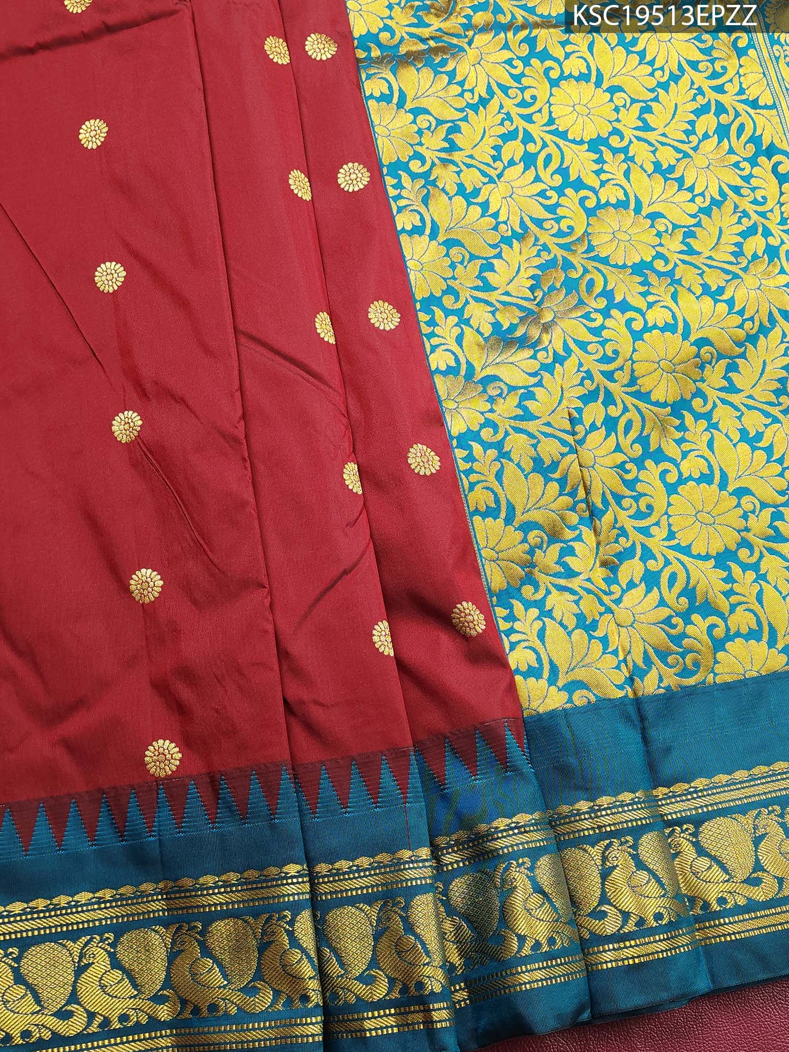 Red and Green Blended Soft Silk Saree with Floral Motifs and Zari Temple Border