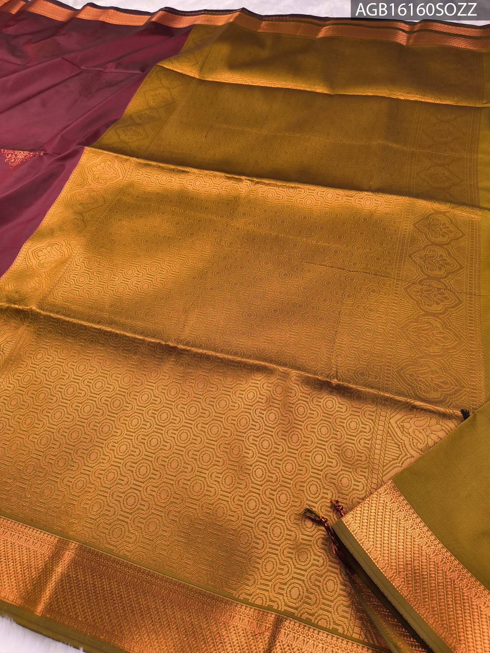 Elegant maroon saree with intricate zari work and golden pallu.