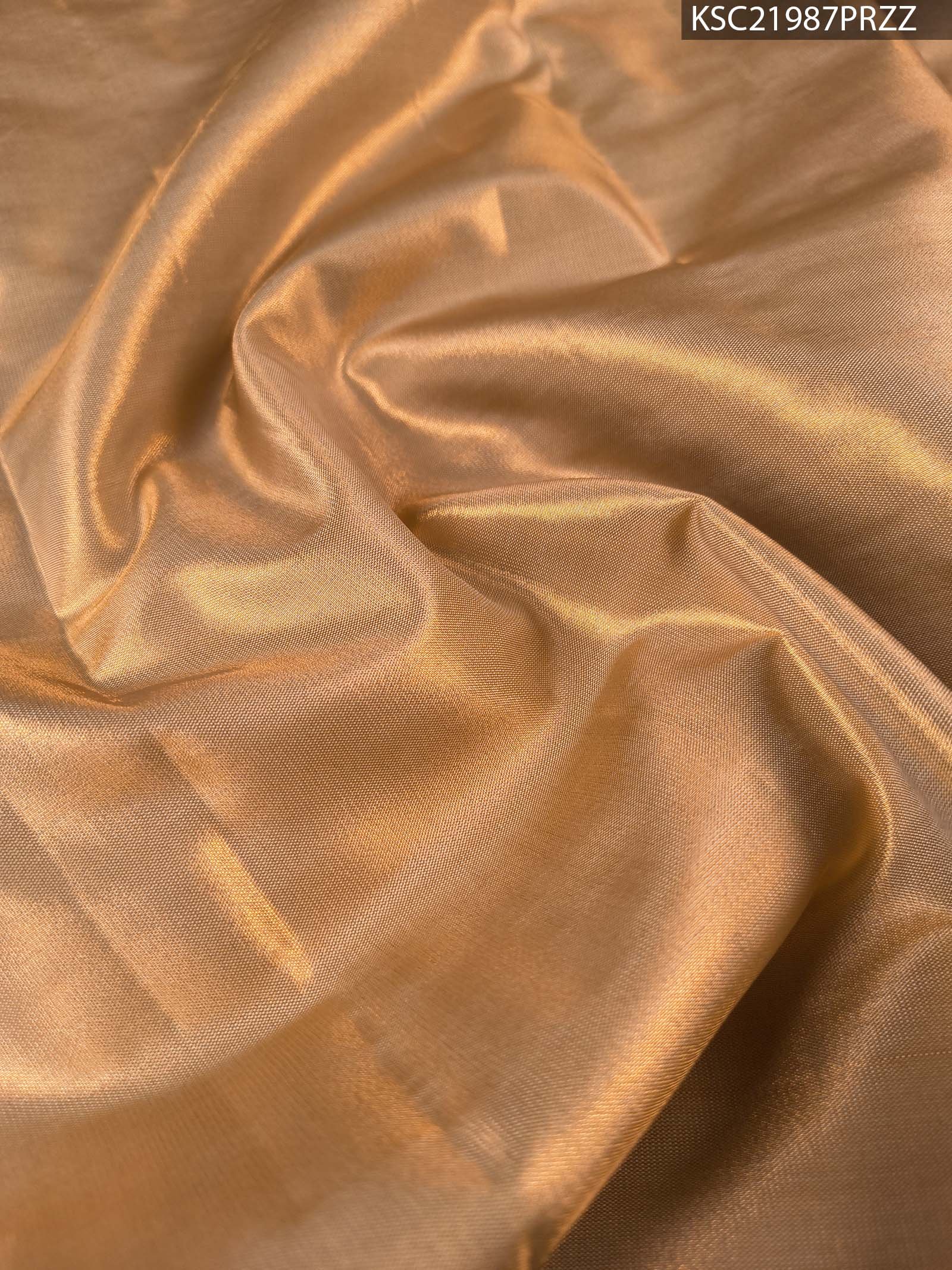 This exquisite orange tissue silk saree captures the essence of elegance with its rich, vibrant hue and delicate paisley motifs gracefully woven across the body. The saree’s texture reflects a luxurious feel, perfect for grand occasions. The pallu is adorned with a lavish arrangement of traditional zari lines, enhancing its opulence. Complementing this is a blouse in matching tones, designed to complete your regal look.