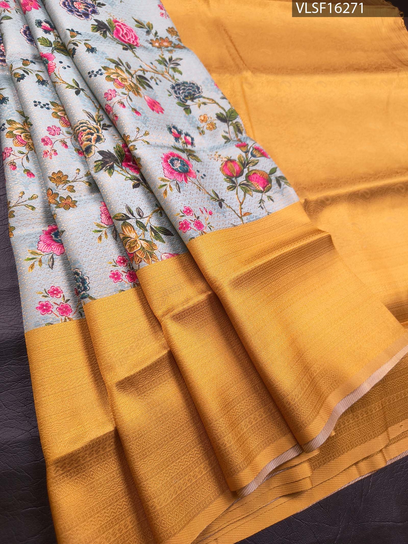 Elegant Pastel Blue Fancy Silk Saree adorned with vibrant floral motifs and a rich mustard border. Includes unstitched blouse.