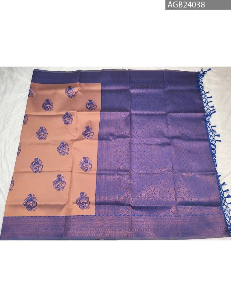 Tags: fancy saree, Indian Ethnic Wear, peach saree, purple pallu, Semi Soft Silk