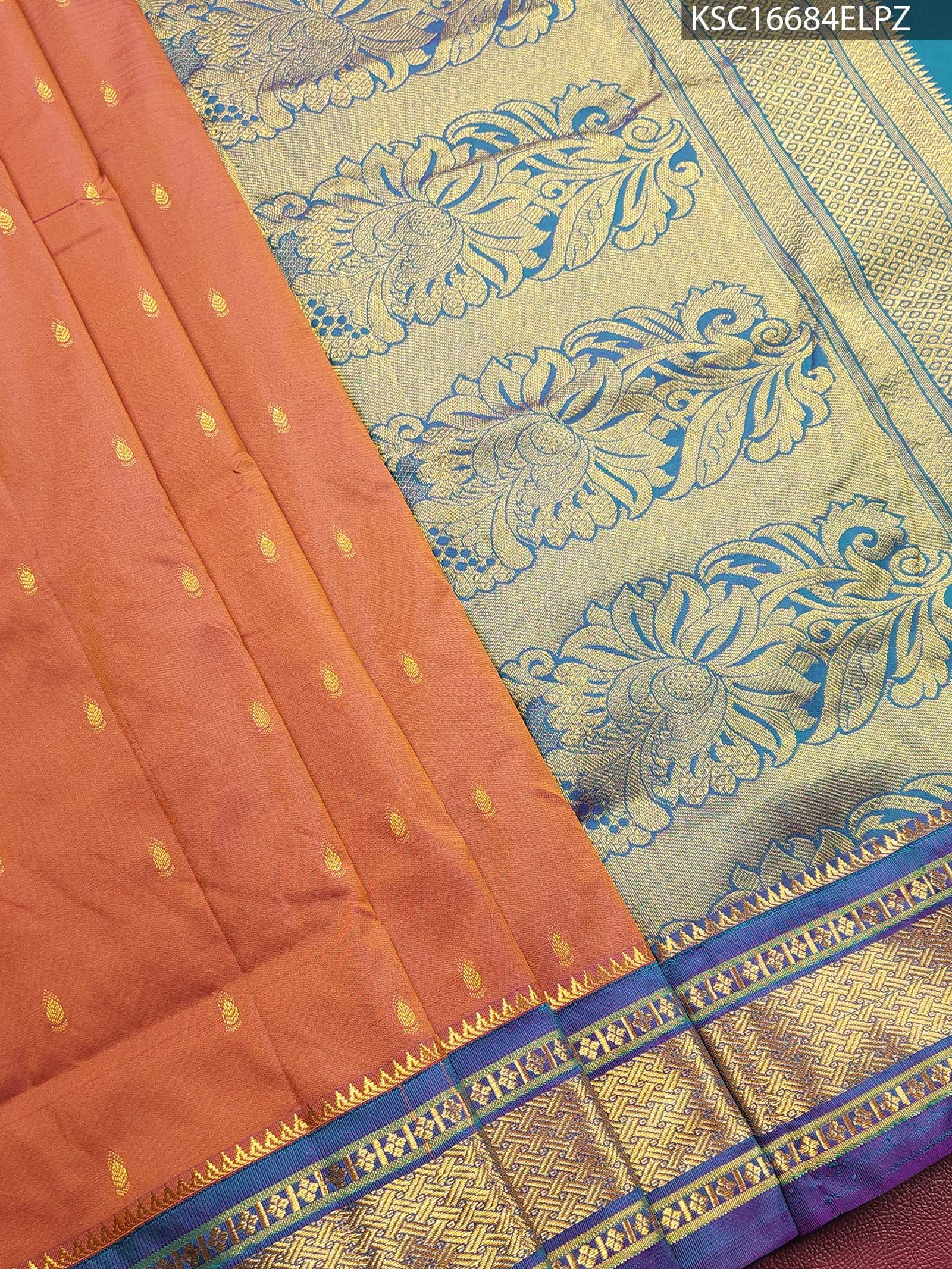 Tags: blended soft silk, festive saree, paisley motif saree, peach saree, zari pallu