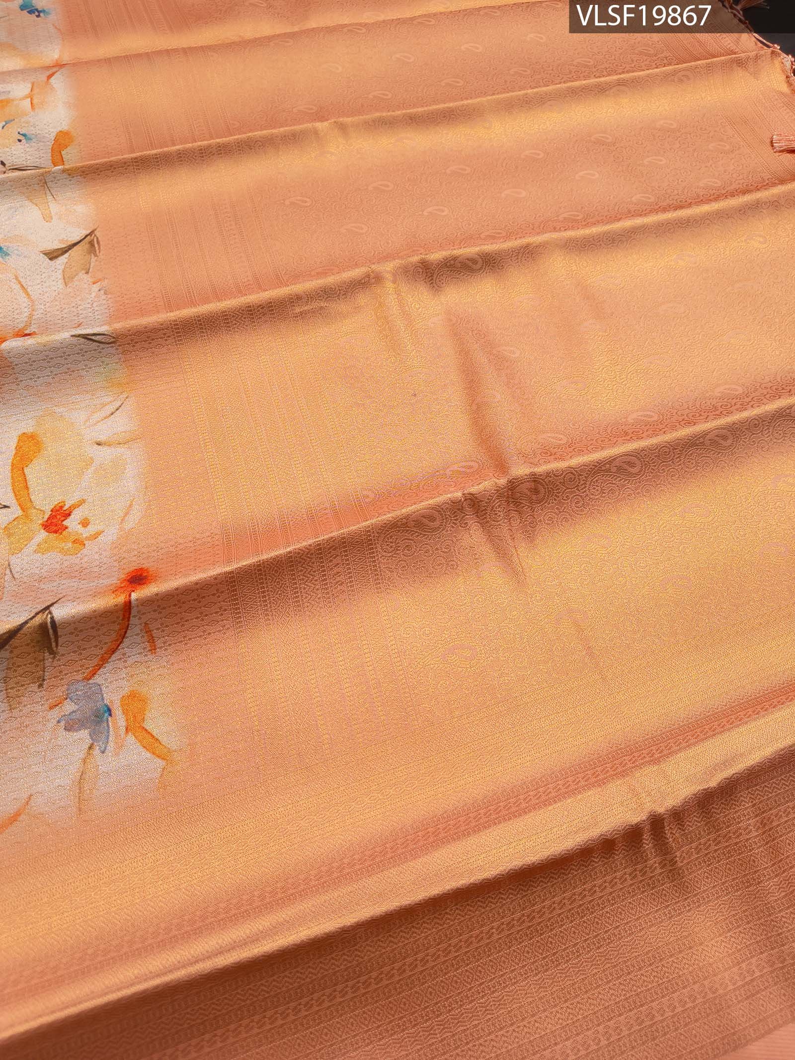 Peach Fancy Silk Saree adorned with vibrant floral motifs and a graceful border. Includes unstitched blouse.