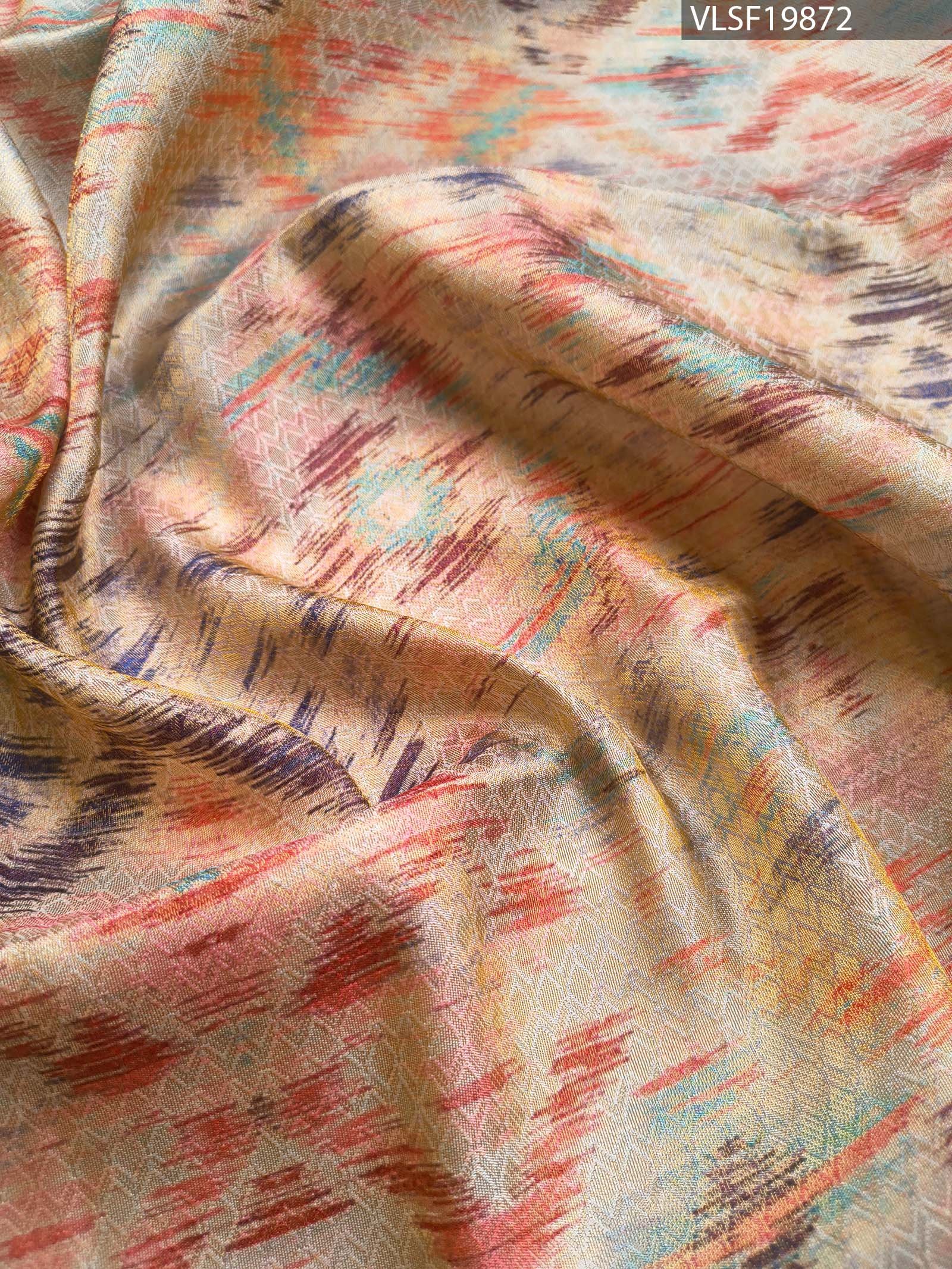 Enchanting Peach Fancy Silk Saree with Vibrant Ikat Motifs and Rich Zari Border. Includes unstitched blouse.