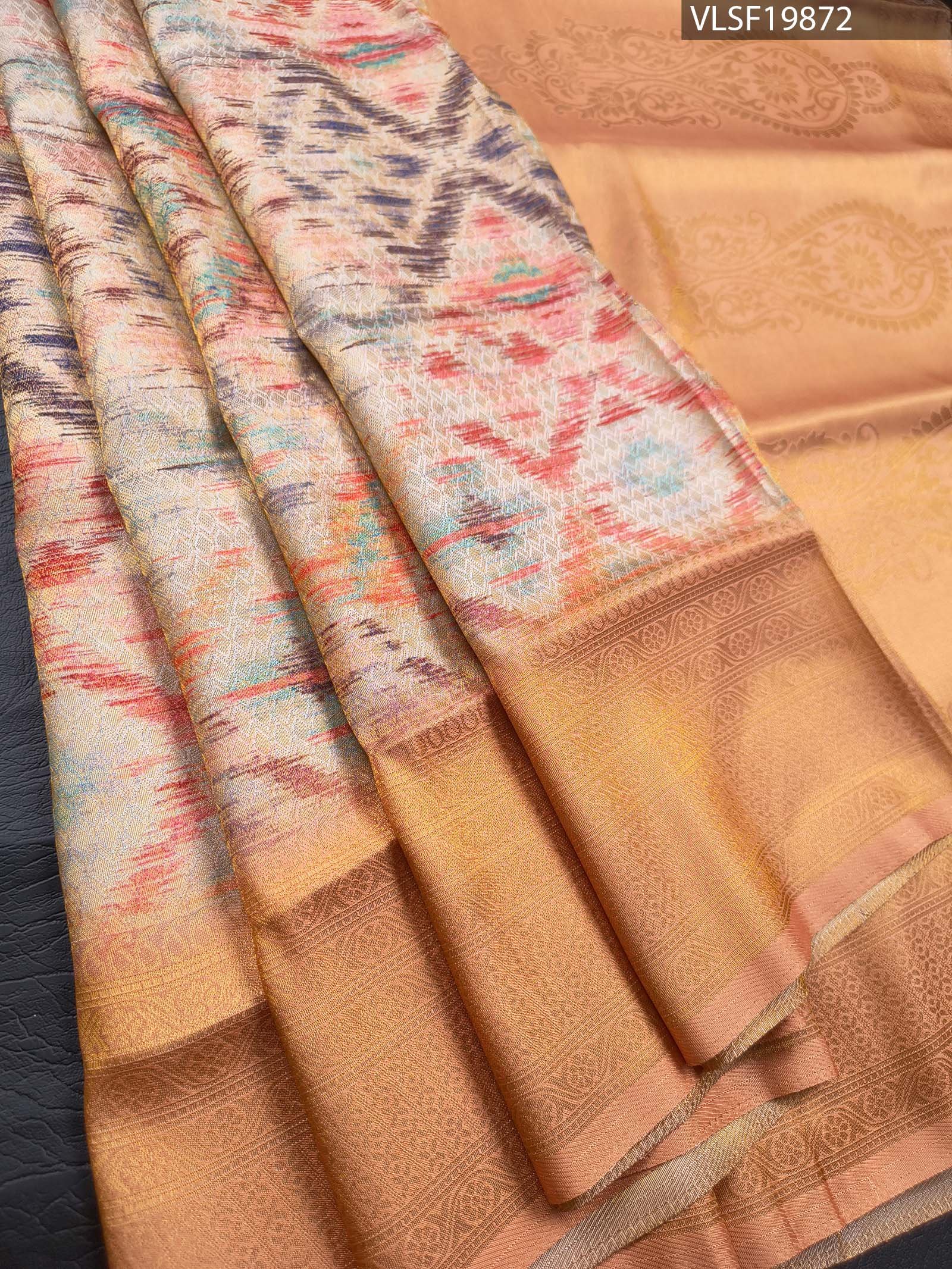 Tags: fancy silk, festive saree, ikat saree, peach saree, zari pallu