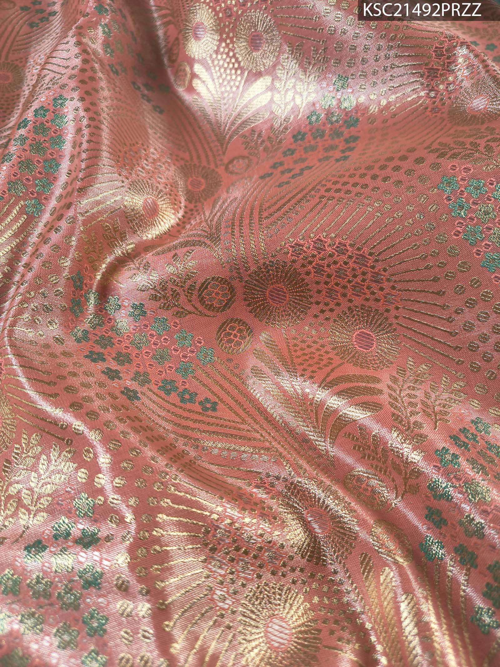 This exquisite pink tissue saree is a masterpiece of elegance, showcasing beautifully intricate motifs that dance across its soft, luxurious fabric. The saree’s pallu is a work of art, with rich zari lines weaving a tale of tradition and grandeur. Complementing this is the grand green border, adorned with exquisite floral patterns that provide a striking contrast. Paired with a matching blouse, this saree is perfect for making a regal statement at any festive occasion.