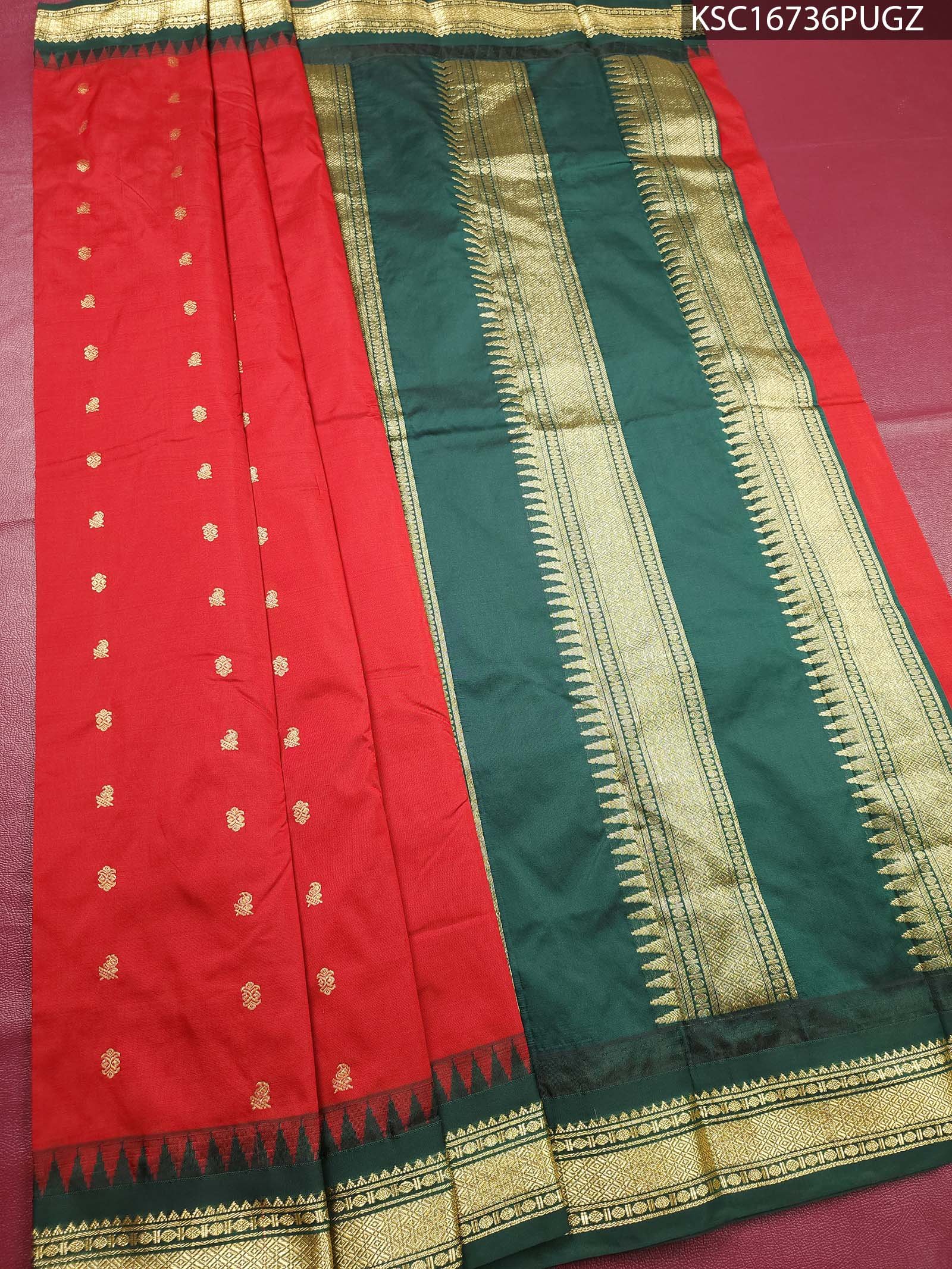 Red and Green Blended Soft Silk Saree with Floral Motifs and Zari Temple Border