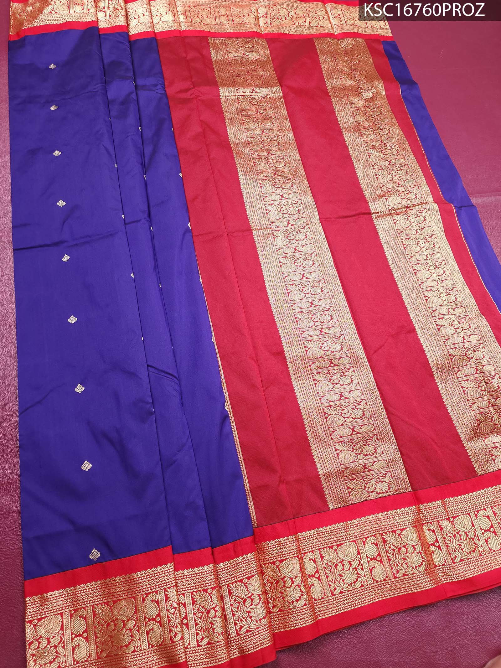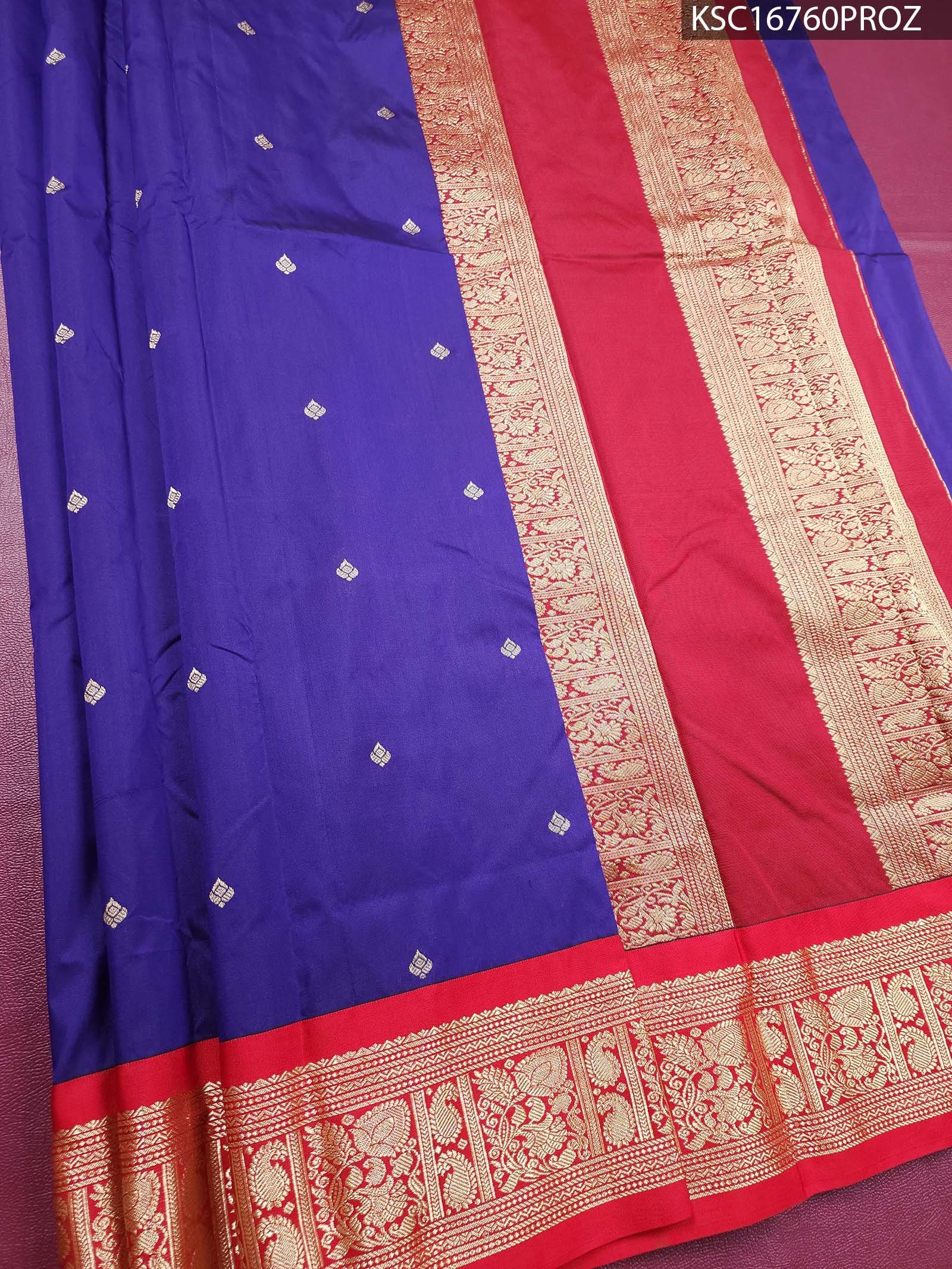 Royal Blue and Red Blended Soft Silk Saree with Gold Butti Motifs and Zari Woven Border