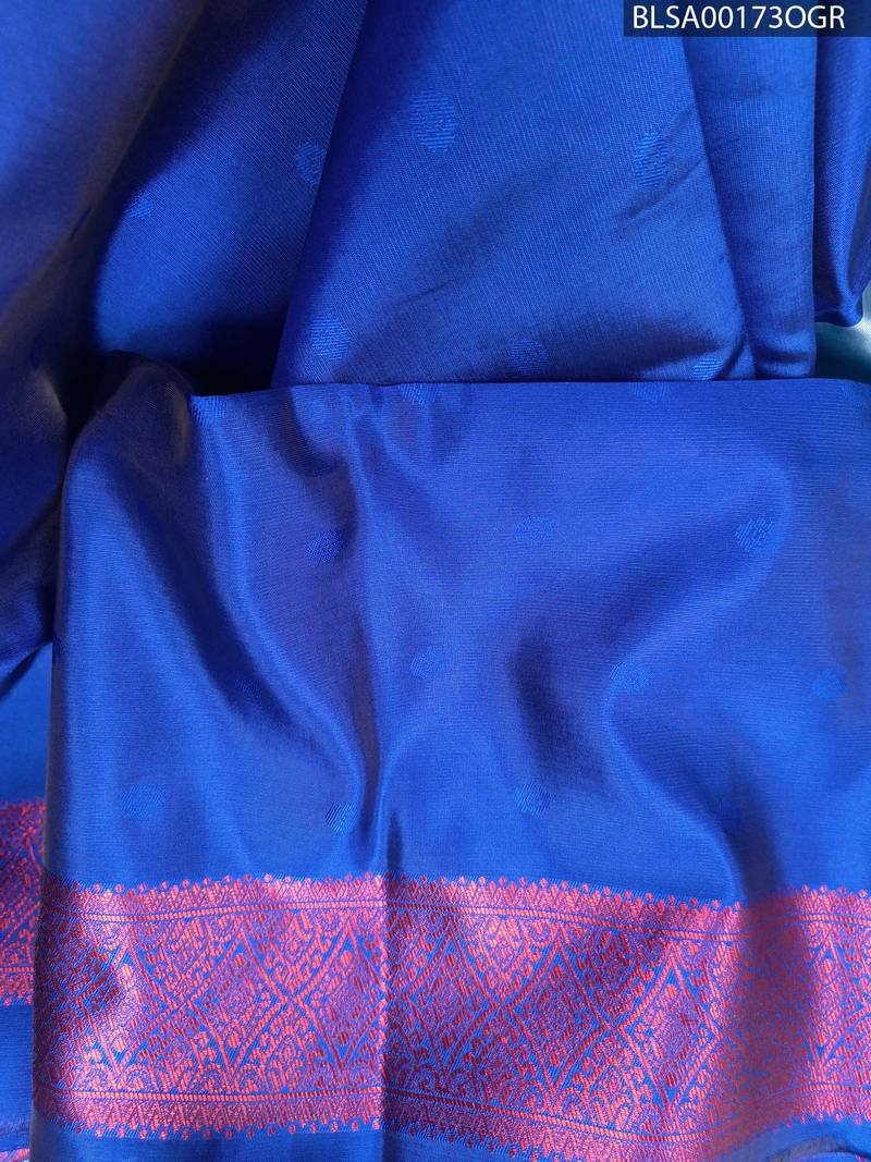This saree features a soothing blue body adorned with intricate motifs that add to its charm. The pallu showcases a rich purple design with eye-catching patterns, complementing the overall look. Paired with a stylish blouse, this saree is perfect for various occasions.