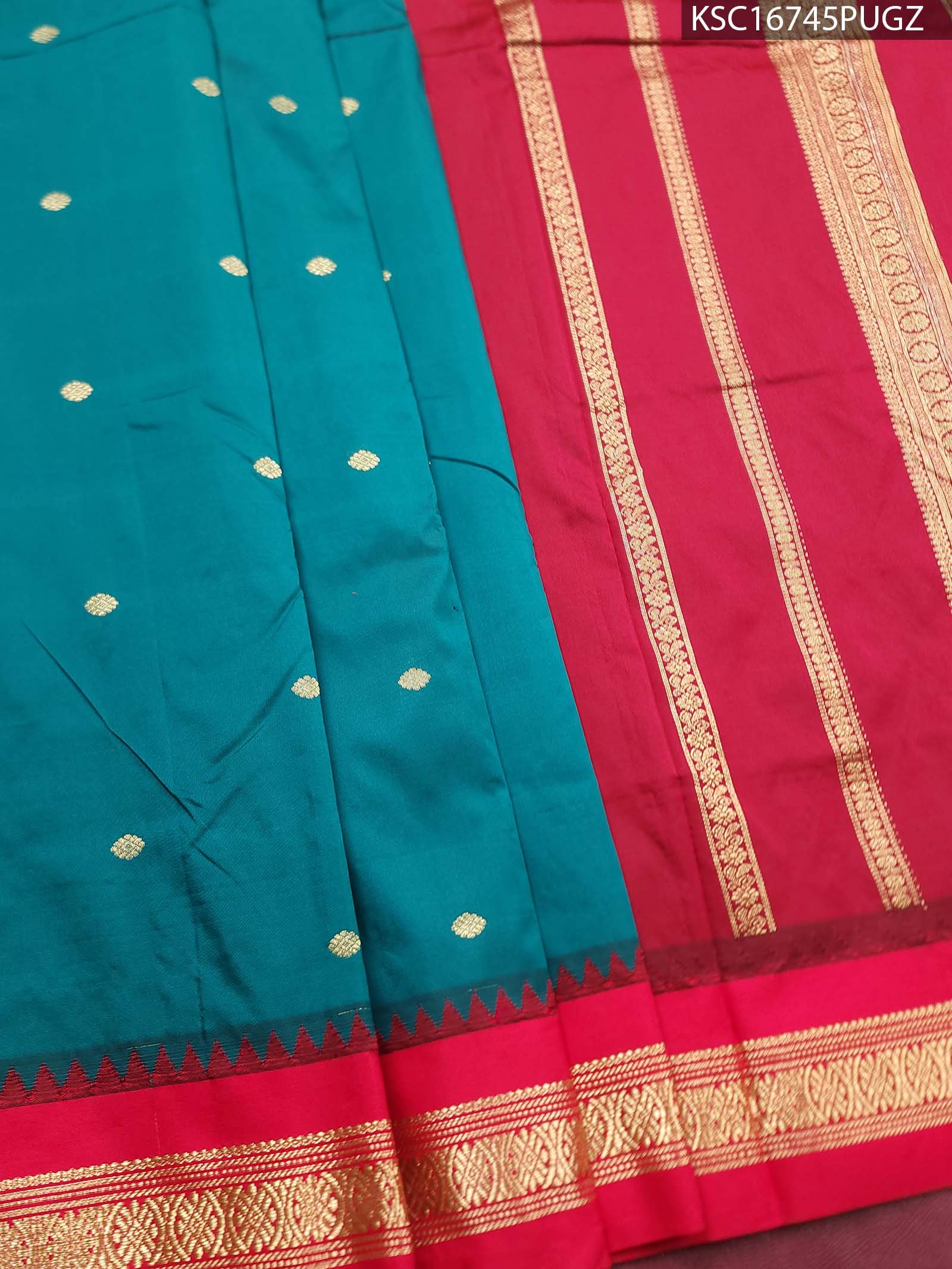 Teal Blended Soft Silk Saree with Gold Butti Motifs and Rich Maroon Zari Border