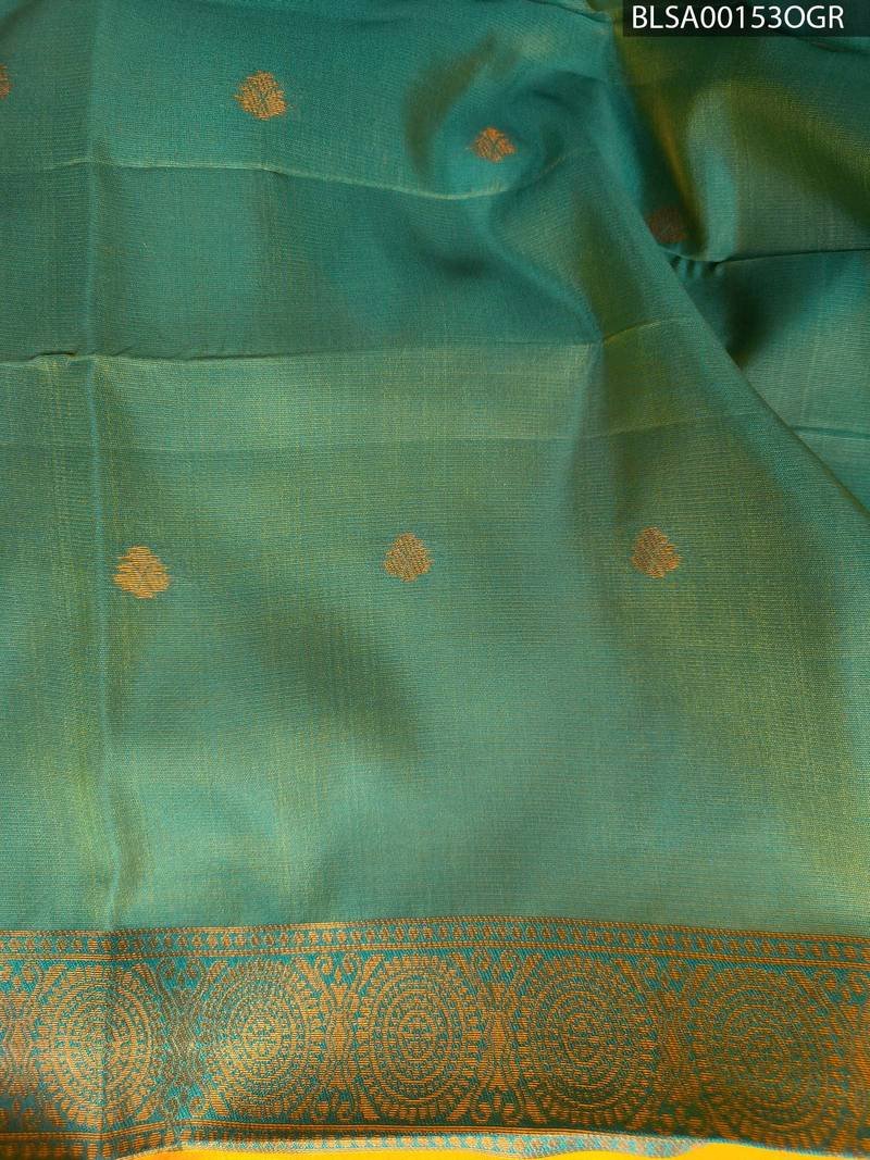 The saree features a bright yellow body adorned with delicate floral motifs that bring out its charm. The pallu is richly designed in teal, showcasing intricate weaving patterns, while complementing the overall appeal. A coordinated blouse completes the look, making it a perfect choice for festive occasions.